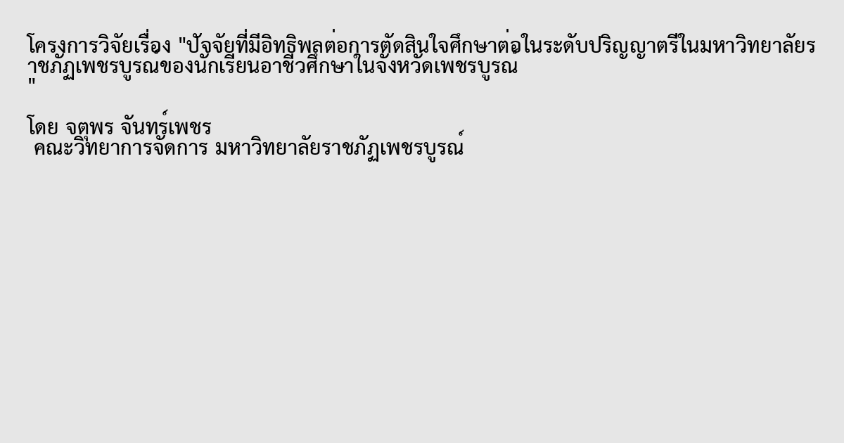 ปัจจัยที่มีอิทธิพลต่อการตัดสินใจศึกษาต่อในระดับปริญญาตรีในมหาวิทยาลัยราชภัฏเพชรบูรณ์ของนักเรียนอาชีวศึกษาในจังหวัดเพชรบูรณ์