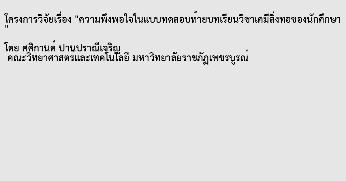 การศึกษาความพึงพอใจในแบบทดสอบท้ายบทเรียนวิชาเคมีสิ่งทอ ของนักศึกษาสาขาวิชาเคมีคณะวิทยาศาสตร์และเทคโนโลยี มหาวิทยาลัยราชภัฏเพชรบูรณ์ ระดับปริญญาตรี ชั้นปีที่ 2 หมู่เรียน 5211020021 จำนวน 10 คน ในภาคเรียนที่ 2 ปีการศึกษา 2553 จะใช้แบบสอบถามความพึงพอใจเป็นเครื่องมือหลักในการเก็บรวบรวมข้อมูล แล้วนำมาวิเคราะห์เพื่อเป็นข้อมูลและแนวทางในการพัฒนาระบบการเรียนการสอนของวิชาเคมีสิ่งทอ ให้มีประสิทธิภาพในการเรียนรู้และนำไปใช้ในวัดผลสัมฤทธิ์ทางการเรียนการสอนให้ดียิ่งขึ้น ข้อมูลที่ได้จากแบบสอบถามจะเป็นระดับความพึงพอใจในแบบทดสอบท้ายบทเรียนวิชาเคมีสิ่งทอของนักศึกษา สาขาวิชาเคมี ซึ่งนำมาวิเคราะห์หาค่าเฉลี่ย ( X̄ ) และส่วนเบี่ยงเบนมาตรฐาน ( S.D. ) ผลที่ได้จากงานวิจัยนี้ พบว่า โดยรวมแล้วมีความพึงพอใจในแบบทดสอบท้ายบทเรียนวิชาเคมีสิ่งทอ อยู่ในระดับมาก ( X̄ = 4.40, S.D. = 0.59 )