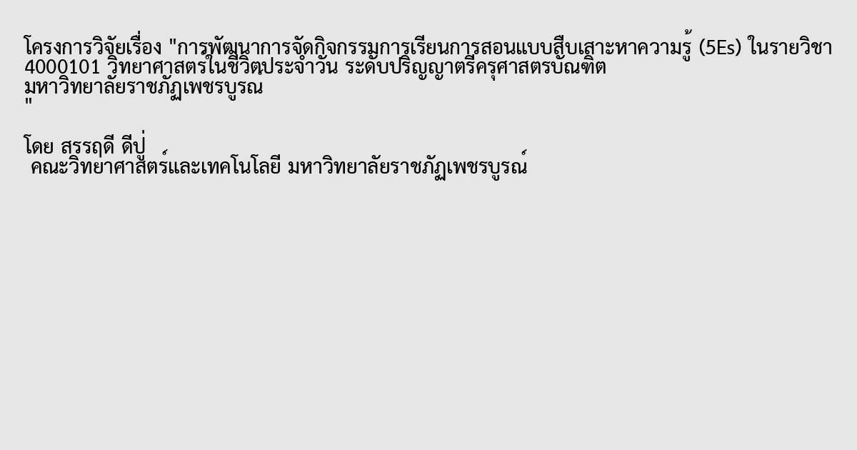 การพัฒนาการจัดกิจกรรมการเรียนการสอนแบบสืบเสาะหาความรู้ (5Es) ในรายวิชา 4000101 วิทยาศาสตร์ในชีวิตประจำวัน ระดับปริญญาตรีครุศาสตรบัณฑิต มหาวิทยาลัยราชภัฏเพชรบูรณ์