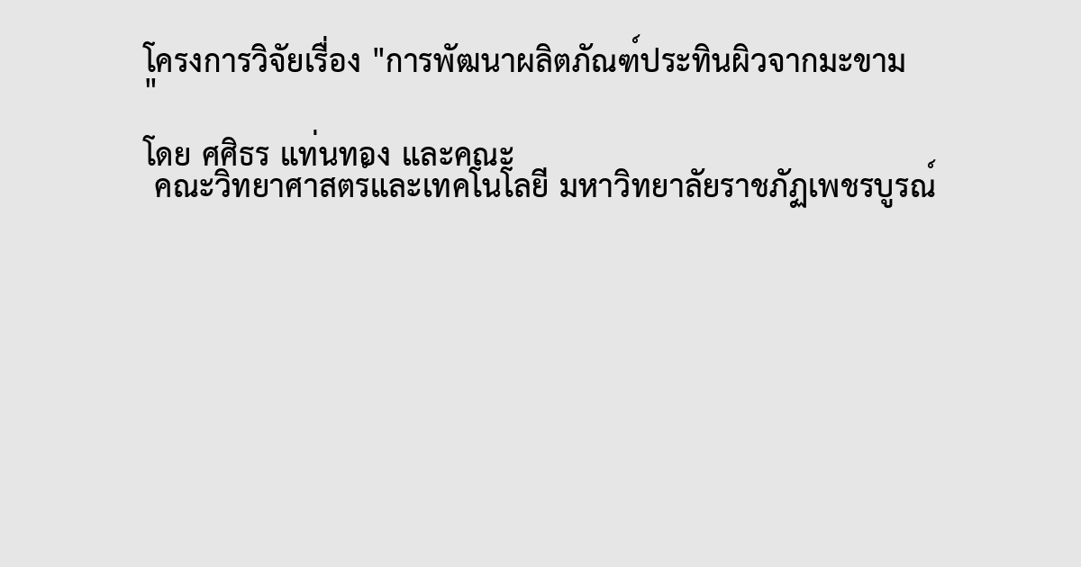 การวิจัยครั้งนี้ได้พัฒนาผลิตภัณฑ์ประทินผิวจากมะขาม (สบู่ก้อนมะขาม สบู่เหลวมะขาม และโลชันมะขาม) นำน้ำมะขามเปียกมาละลายน้ำกรอง แยกกากออกระเหยน้ำออกเก็บไว้ในตู้เย็นไว้ใช้ เตรียมสบู่ก้อนสบู่เหลว และโลชัน จากการสำรวจสบู่ก้อนพบว่า ในท้องตลาดมีการผลิตสบู่ก้อนมะขามหลายชนิด แต่ละชนิดมีราคาต่างๆ กันสบู่เหลวมะขามมีขายในท้องตลาดยังไม่แพร่หลาย จากเตรียมสบู่เหลวมะขามและศึกษาสมบัติของมะขามเหลวมะขามที่เตรียมขึ้น 4 สูตร แล้วศึกษาลักษณะทางกายภาพของสบู่เหลวมะขาม พบว่า สูตรพื้นฐานไม่แยกชั้น เมื่อเก็บไว้นาน โลชันมะขาม เมื่อนำมาศึกษาลักษณะพบว่า ลักษณะเนื้อของโลชันเนียนละเอียด สีขาว กลิ่นหอม ไม่มีการแยกชั้น โลชันไหลได้ดี ความรู้สึกเวลาทา ทาง่ายไม่เหนอะหนะ สูตรที่ 4 การใส่น้ำมะขามมากทำให้มีความเหนอะหนะบ้าง ซึมเข้าผิวได้ดี เมื่อนำไปทดลองกับอาสาสมัครแล้วตอบคำถามผู้ตอบแบบสอบถาม พึงพอใจความซึมซับเข้าสู่ผิว สี กลิ่นของสูตรที่ 4 มากที่สุด ถ้ามีผลิตภัณฑ์วางจำหน่ายจะซื้อสูตรที่ 4 มากที่สุด ต้นทุนการผลิตโลชันมะขามรวมหลอดบรรจุพร้อมฉลาก ใช้เนื้อสารจำนวน 19 กรัมต่อหลอด 15.2 บาทต่อหลอด