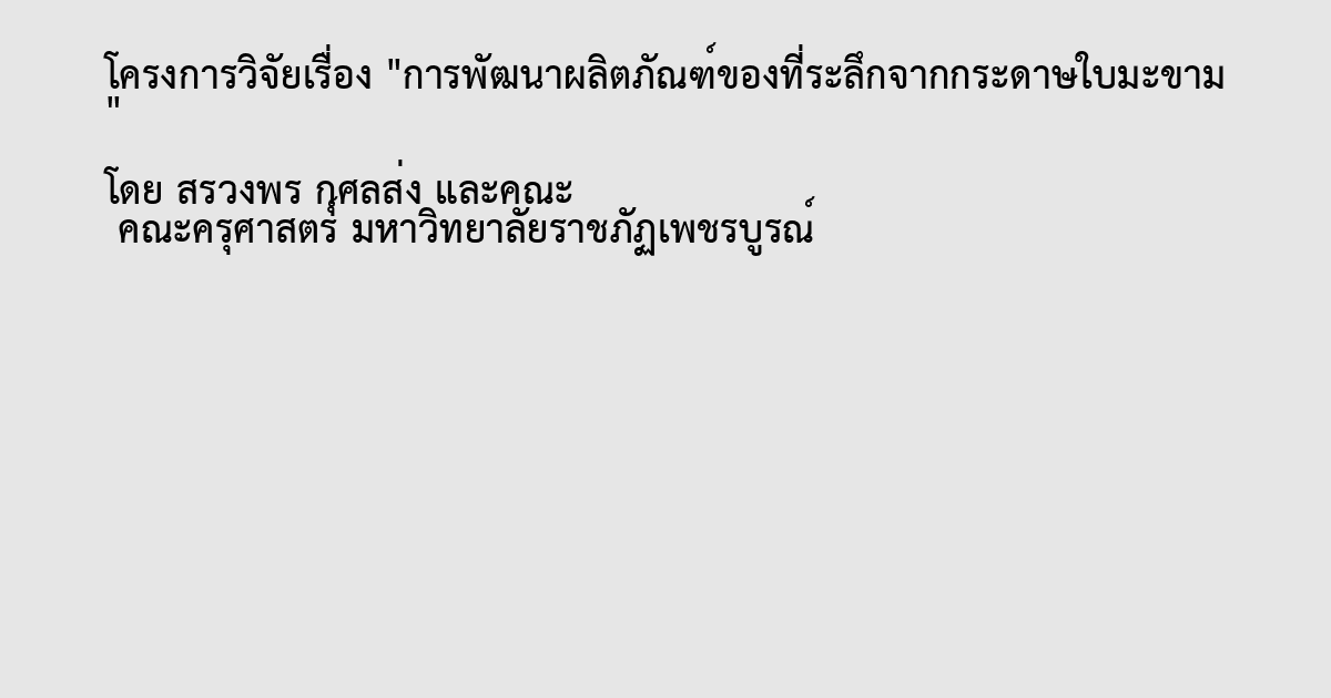 โครงการวิจัยครั้งนี้เป็นวิจัยเชิงปฏิบัติการ โดยมีความมุ่งหมาย ในการวิจัยครั้งนี้ เพื่อศึกษาบริบทและทัศนคติของนักท่องเที่ยวเพื่อพัฒนาผลิตภัณฑ์ของที่ระลึกจากกระดาษใบมะขามจำนวน 10 รูปแบบเพื่อส่งเสริมความรู้ในการพัฒนาผลิตภัณฑ์ของที่ระลึกจากใบมะขาม เพื่อศึกษาความพึงพอใจของผู้รับการอบรมเกี่ยวกับการผลิตภัณฑ์ที่ระลึกจากกระดาษใบมะขาม โดยกลุ่มเป้าหมายที่ใช้ในการวิจัย คือ กลุ่มบุคลากรในจังหวัดเพชรบูรณ์และบุคคลที่จำหน่ายผลิตภัณฑ์ในท้องถิ่น จำนวน 40 คน เครื่องมือในการดำเนินการคือ แบบสอบถาม เพื่อศึกษาบริบท และทัศนคติในการซื้อผลิตภัณฑ์ของจังหวัดเพชรบูรณ์ ต่อจากนั้นดำเนินการอบรมเชิงปฏิบัติการให้แก่กลุ่มเป้าหมาย จำนวน 2 วัน เกี่ยวกับ ด้านการออกแบบผลิตภัณฑ์ ของที่ระลึกจากกระดาษใบมะขาม ผลิตผลิตภัณฑ์ของที่ระลึกรูปแบบใหม่ และสอบถามความพึงพอใจของกลุ่มผู้เข้ารับการอบรมในการได้รับการพัฒนารูปแบบผลิตภัณฑ์ของที่ระลึกจากกระดาษใบมะขาม สถิติที่ใช้ในการวิเคราะห์ข้อมูล คือ ค่าเฉลี่ยร้อยละ ผลการวิเคราะห์ข้อมูลพบว่า