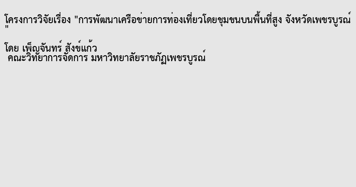 การวิจัยนี้มีวัตถุประสงค์เพื่อพัฒนาเครือข่ายการท่องเที่ยวโดยชุมชนบนพื้นที่สูงของจังหวัดเพชรบูรณ์ให้ยั่งยืนด้วยการพัฒนาปัจจัยเกื้อหนุนในด้านการจัดการองค์กรการท่องเที่ยวชุมชน การพัฒนาธุรกิจท่องเที่ยวเชิงวัฒนธรรมชาวเขาเผ่าลีซอ การพัฒนาแหล่งเรียนรู้วัฒนธรรมชนเผ่า การออกแบบผลิตภัณฑ์ของตกแต่งบ้านจากวัฒนธรรมการแต่งกายของชนเผ่า การจัดการการท่องเที่ยวผจญภัยด้วยจักรยานเสือภูเขา การจัดการโฮมสเตย์โดยชุมชน และ การจัดการการตลาดเพื่อการประชาสัมพันธ์การท่องเที่ยวโดยชุมชน กลุ่มเป้าหมาย คือ ชนเผ่าม้ง ลีซอ เย้า และมูเซอ ในหมู่บ้านเล่าลือ บ้านเล่าเน้ง และบ้านเพชรดำ ตัวแทนภาครัฐ และเอกชน เครื่องมือที่ใช้เก็บรวบรวมข้อมูล ได้แก่ การประชุมเชิงปฏิบัติการ การลงพื้นที่โดยกระบวนการ PAR การประชาคม การสังเกต การสัมภาษณ์เชิงลึก การสนทนากลุ่มย่อย การวิเคราะห์ข้อมูลโดยการวิเคราะห์เนื้อหา