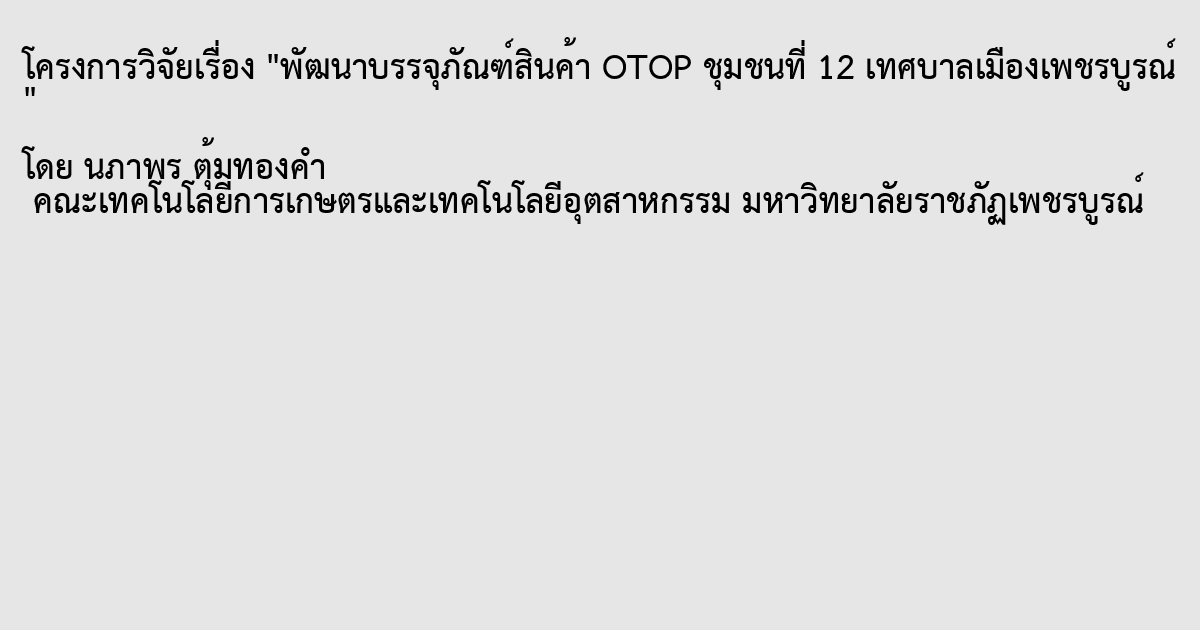 การวิจัยครั้งนี้มีวัตถุประสงค์เพื่อพัฒนาบรรจุภัณฑ์สินค้า OTOP ชุมชนที่ 12 เทศบาลเมืองเพชรบูรณ์ ให้มีประสิทธิภาพด้านโครงสร้างและด้านกราฟิกและออกแบบเครื่องหมายการค้า