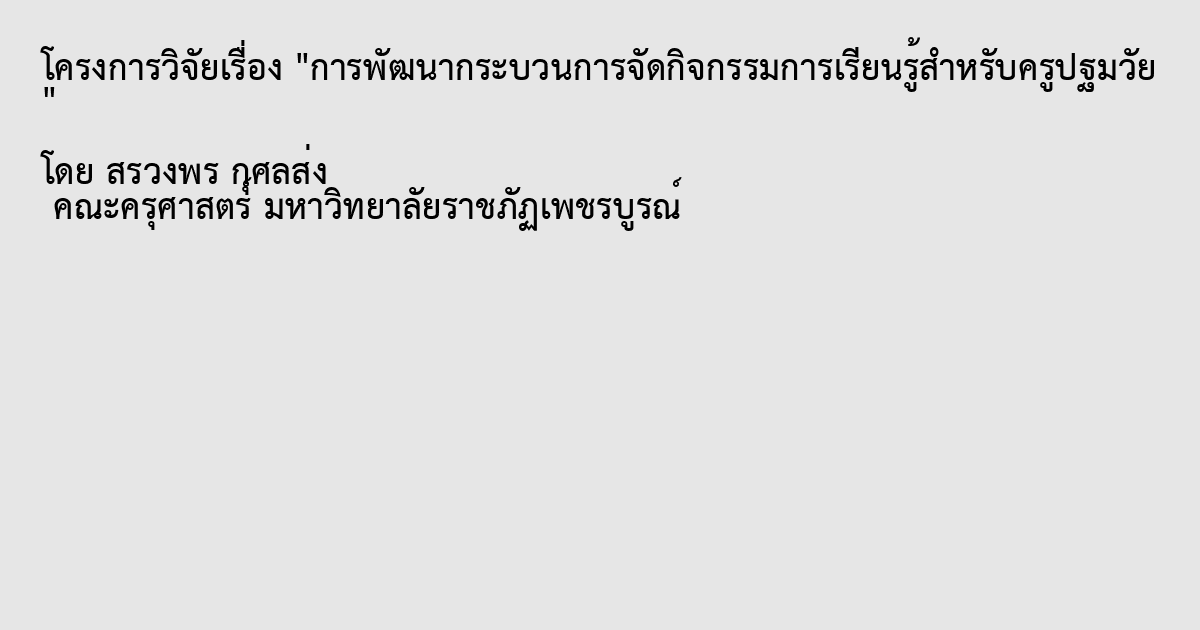 กลุ่มเป้าหมาย คือ ครูปฐมวัยจากศูนย์เด็กก่อนวัยเรียนมหาวิทยาลัยราชภัฏเพชรบูรณ์ ศูนย์พัฒนาเด็กก่อนวัยเรียนในสังกัดองค์กรปกครองส่วนตำบลดงมูลเหล็ก โรงเรียนรัฐบาลสังกัดสำนักงานเขตพื้นที่การศึกษาเพชรบูรณ์ (บ้านซับขลุง) และโรงเรียนเทศบาลสังกัดสำนักงานเขตพื้นที่การศึกษาเพชรบูรณ์ (เทศบาลตำบลดงขุย) จำนวน 20 คน ผู้ปกครองและบุคลากรที่เกี่ยวข้องกับเด็กก่อนวัยเรียนจากศูนย์เด็กก่อนวัยเรียนมหาวิทยาลัยราชภัฏเพชรบูรณ์ศูนย์พัฒนาเด็กก่อนวัยเรียนในสังกัดองค์กรปกครองส่วนตำบลดงมูลเหล็ก โรงเรียนรัฐบาลสังกัดสำนักงานเขตพื้นที่การศึกษาเพชรบูรณ์เขต 1 (โรงเรียนบ้านซับขลุง) และโรงเรียนเทศบาลสังกัดเทศบาลตำบล (เทศบาลตำบลดงขุย) จำนวน 80 คน รวม 100 คน ซึ่งได้มาโดยการเลือกแบบเจาะจง เครื่องมือที่ใช้เป็นแบบสอบถามความคิดเห็น แบบแผนการอบรมแบบสำรวจความพึงพอใจที่ผู้วิจัยสร้างขึ้น สถิติที่ใช้ในการวิเคราะห์ข้อมูลได้แก่ ร้อยละ ค่าคะแนนเฉลี่ย ค่าความแปรปรวน และส่วนเบี่ยงเบนมาตรฐาน