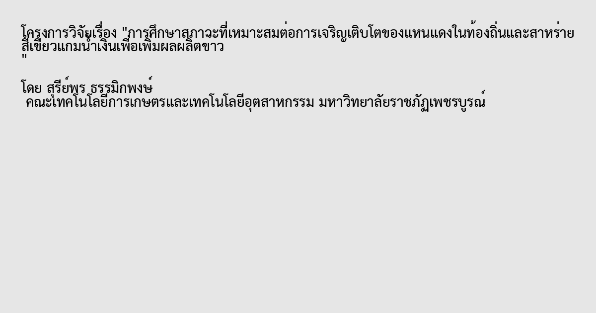 การศึกษาสภาวะที่เหมาะสมต่อการเจริญเติบโตของแหนแดงในท้องถิ่นและสาหร่าย สีเขียวแกมน้ำเงินเพื่อเพิ่มผลผลิตข้าว
