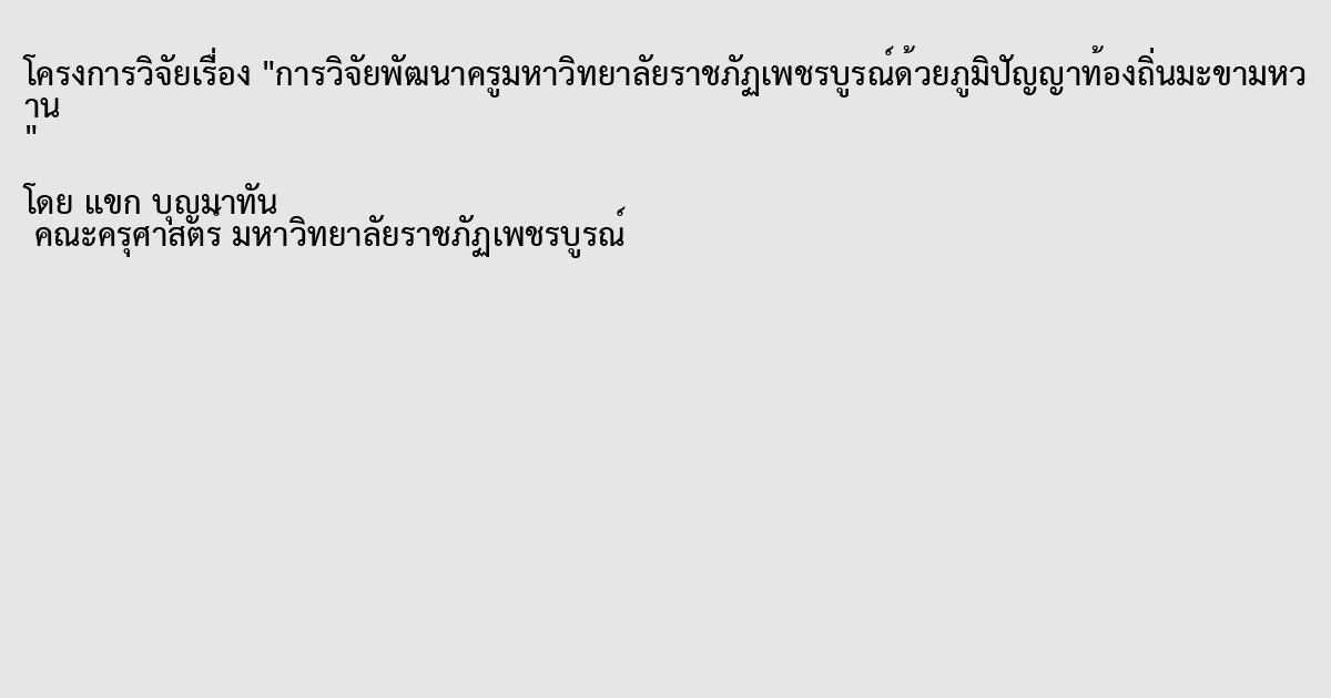 การวิจัยเรื่อง การวิจัยพัฒนาครูมหาวิทยาลัยราชภัฏเพชรบูรณ์ด้วยภูมิปัญญาท้องถิ่นมะขามหวาน เป็นการวิจัยประเภทการวิจัยและพัฒนา มีวัตถุประสงค์เพื่อ 1. พัฒนาครูและนักศึกษาที่จะเป็นครูของท้องถิ่นให้มีทักษะด้านการวิจัยจากโจทย์ปัญหาภูมิปัญญาท้องถิ่นอย่างมีคุณภาพ เป็นระบบ และสามารถกระจายสู่การศึกษาระดับโรงเรียน รวมทั้งชุมชนในท้องถิ่น 2. พัฒนาและแก้ปัญหาท้องถิ่นอย่างยั่งยืน จากการใช้ผลงานวิจัยโจทย์ปัญหาภูมิปัญญาท้องถิ่นนั้น 3. พัฒนาหลักสูตรมาตรฐานที่สอดคล้องกับอัตลักษณ์ของมหาวิทยาลัย 4. พัฒนางานวิจัยเครือข่ายที่มีประโยชน์ ในการพัฒนาท้องถิ่น พัฒนาประเทศอย่างเป็นระบบ มีคุณภาพ ผู้ร่วมการวิจัยเป็น คณาจารย์ในหลักสูตรครุศาสตร์บัณฑิต กลุ่มพื้นฐานการศึกษา จำนวน 1 คน กลุ่มวิชาวัดผลและประเมินผล จำนวน 1 คน โปรแกรมวิชาภาษาอังกฤษ จำนวน 1 คน และโปรแกรมวิชาคณิตศาสตร์ จำนวน 1 คน รวมทั้งสิ้น 4 คน นักศึกษาที่ร่วมวิจัยเป็น นักศึกษาระดับปริญญาตรีในหลักสูตรครุศาสตร์บัณฑิต โปรแกรมวิชาการศึกษาปฐมวัย ชั้นปีที่ 4 โปรแกรมวิชาวิทยาศาสตร์ ชั้นปีที่ 2 ,3 และ 4 โปรแกรมวิชาภาษาอังกฤษชั้นปีที่ 1 และโปรแกรมวิชาคณิตศาสตร์ ชั้นปีที่ 1 จำนวน 307 คน เป็นผู้ปฏิบัติการในโครงการวิจัย เป็นผลผลิตของโครงการวิจัยในด้านการพัฒนาบุคลากรที่ได้รับการพัฒนาทักษะการวิจัย เครื่องมือที่ใช้ในการวิจัยมี 3 ชนิด คือ 1. แบบสอบถามความคิดเห็นเกี่ยวกับภูมิปัญญาท้องถิ่น 2. แบบสัมภาษณ์เพื่อพัฒนาองค์ความรู้เกี่ยวกับภูมิปัญญาท้องถิ่นมะขามหวาน 3. แบบฝึกทักษะการวิจัย เรื่องการพัฒนาองค์ความรู้เกี่ยวกับภูมิปัญญาท้องถิ่นมะขามหวาน ผู้วิจัยเก็บรวบรวมข้อมูลจากผลการประชุมเชิงปฏิบัติการ การสัมภาษณ์และการปฏิบัติกิจกรรมตามแบบฝึกทักษะการวิจัยและรวบรวมข้อมูลจากผู้ร่วมวิจัย วิเคราะห์ข้อมูล ข้อมูลจากการประชุมเพื่อพัฒนาทักษะการวิจัยของผู้วิจัย ผู้ร่วมวิจัยและกลุ่มตัวอย่าง นำข้อมูลมาวิเคราะห์และสรุปเนื้อหา ข้อมูลจากแบบสอบถาม นำมาวิเคราะห์ค่าความถี่และค่าร้อยละ ข้อมูลจากการสัมภาษณ์นำมาสรุปผลเป็นรายบุคคลและเป็นความถี่ ค่าร้อยละในภาพรวมและ ข้อมูลจากแบบฝึกทักษะการวิจัยฯ นำมาสรุปเป็นรายบุคคลและเป็นความถี่ ค่าร้อยละในภาพรวม สรุปผลการวิจัย ผู้วิจัยสรุปข้อค้นพบตามวัตถุประสงค์ของการวิจัย ดังนี้ 1. การพัฒนาครูและนักศึกษาที่จะเป็นครูของท้องถิ่นให้มีทักษะด้านการวิจัยจากโจทย์ปัญหาภูมิปัญญาท้องถิ่นอย่างมีคุณภาพ เป็นระบบ และสามารถกระจายสู่การศึกษาระดับโร