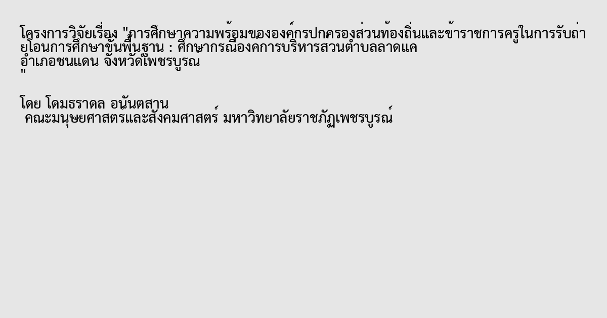 ความพร้อมขององค์กรปกครองส่วนท้องถิ่นและข้าราชการครูในการรับการถ่ายโอนการศึกษาขั้นพื้นฐาน ศึกษากรณีองค์การบริหารส่วนตำบลลาดแค จังหวัดเพชรบูรณ์ มีวัตถุประสงค์เพื่อศึกษาความคิดเห็นเรื่องความพร้อมขององค์การบริหารส่วนตำบลในการรับถ่ายโอนการศึกษาปัญหาอุปสรรคและแนวทางในการเตรียมความพร้องขององค์การบริหารส่วนตำบลในด้านการรับการถ่ายโอนอำนาจการจัดการการศึกษาขั้นพื้นฐาน เพื่อเปรียบเทียบความคิดเห็นของผู้มีส่วนเกี่ยวข้องกับการจัดการศึกษาขั้นพื้นฐานในแง่ของความพร้อมในการรับถ่ายโอนอำนาจการจัดการศึกษาขั้นพื้นฐานขององค์การบริหารส่วนตำบลสามารถสรุปได้ดังนี้ ความคิดเห็นเรื่องความพร้อมขององค์กรปกครองส่วนท้องถิ่นและข้าราชการครูในการรับการถ่ายโอนการศึกษาขั้นพื้นฐาน