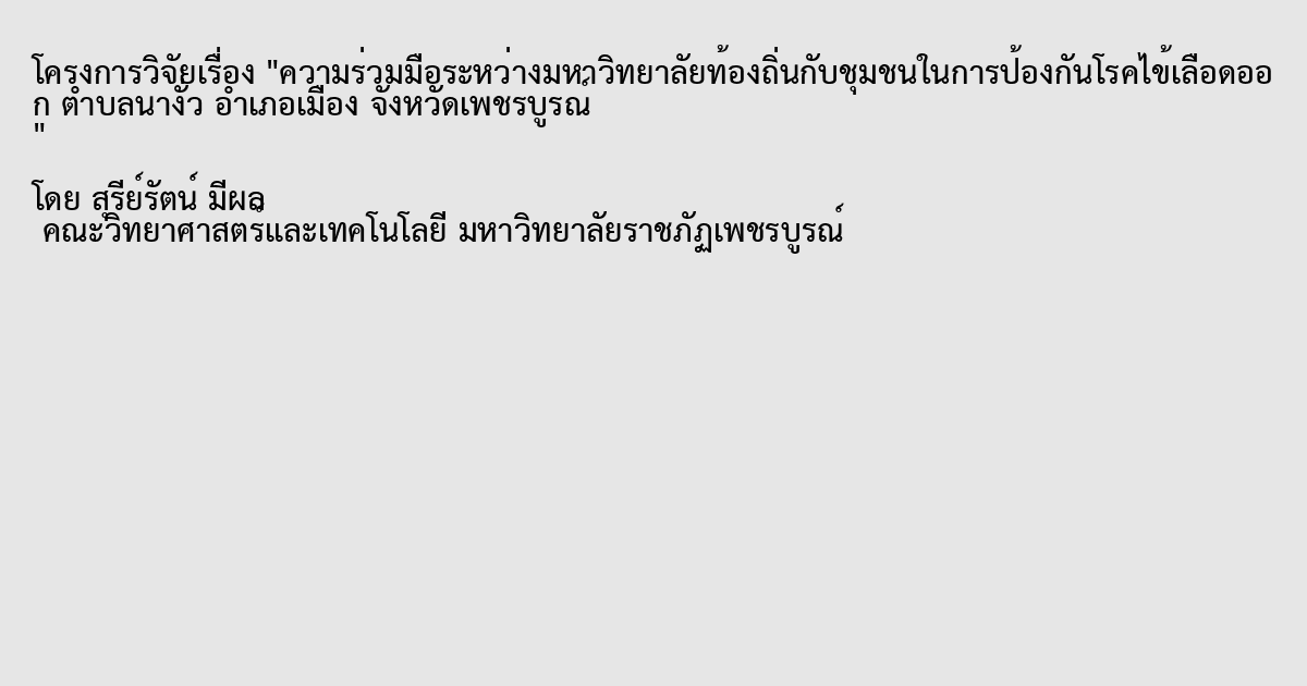 การวิจัยครั้งนี้ เป็นการศึกษาเชิงพรรณนา แบบภาคตัดขวาง (cross-sectional study) มีวัตถุประสงค์เพื่อศึกษาความร่วมมือระหว่างมหาวิทยาลัยราชภัฏเพชรบูรณ์กับชุมชนการป้องกันโรคไข้เลือดออกในเขตพื้นที่ ตำบลนางั่ว อำเภอเมือง จังหวัดเพชรบูรณ์ ประเมินความรู้ และพฤติกรรม รวมทั้งศึกษาปัจจัยด้านการสนับสนุนทางสังคม และความตระหนักของชุมชนในการป้องกันโรคไข้เลือดออก กลุ่มตัวอย่างทั้งหมดจำนวน 365 คน เป็นเพศหญิงร้อยละ 55.1 เป็นเพศชายร้อยละ 44.9 มีอายุมากที่สุด คือ 63 ปี มีอายุน้อยที่สุด คือ 24 ปี และมีอายุเฉลี่ย 52 ปี6 เดือน เครื่องมือที่ใช้ ได้แก่ แบบสอบถาม วิเคราะห์ข้อมูล โดยใช้สถิติแบบพรรณนา ได้แก่ร้อยละ ค่าเฉลี่ย