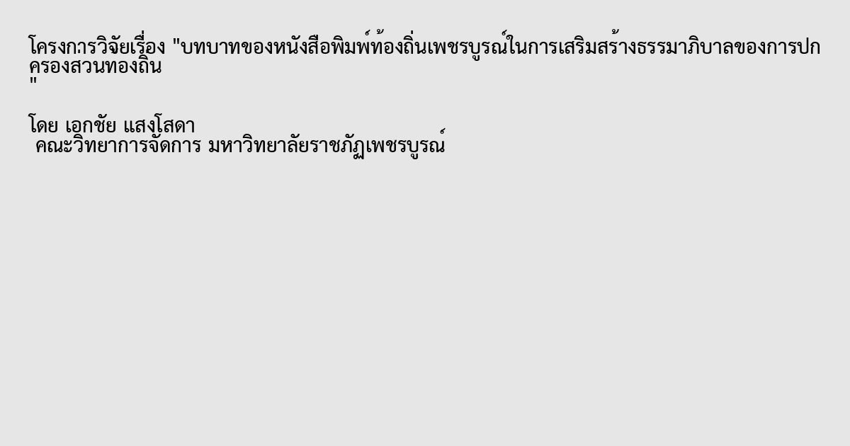 งานวิจัยนี้มีวัตถุประสงค์ เพื่อศึกษานโยบายของหนังสือพิมพ์ท้องถิ่นเพชรบูรณ์ในการ เสริมสร้างธรรมาภิบาลของการปกครองส่วนท้องถิ่น รวมถึงศึกษาการแสดงบทบาทของหนังสือพิมพ์ ท้องถิ่นเพชรบูรณ์ในการนำเสนอเนื้อหาเพื่อเสริมสร้างธรรมาภิบาลของการปกครองส่วนท้องถิ่น ตลอดจนศึกษาแนวทางการพัฒนาศักยภาพของหนังสือพิมพ์ท้องถิ่นเพชรบูรณ์ในการเสริมสร้างธรร มาภิบาลของการปกครองส่วนท้องถิ่น