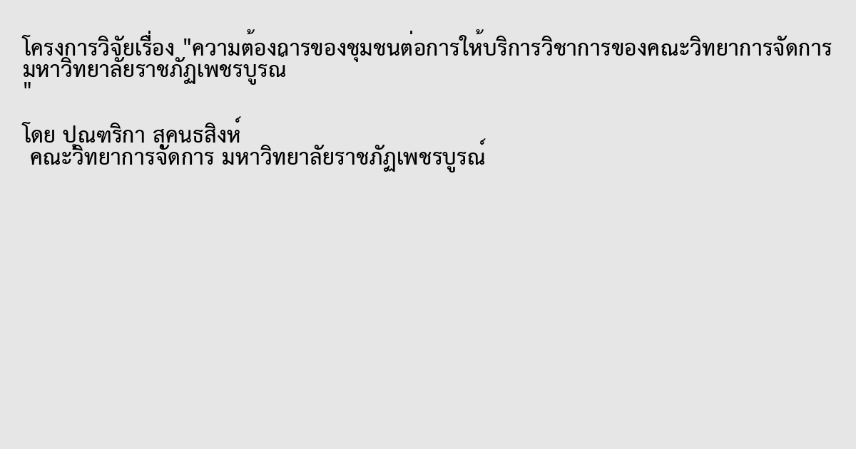 การศึกษาความต้องการของชุมชนต่อการให้บริการวิชาการของคณะวิทยาการจัดการ มหาวิทยาลัยราชภัฏเพชรบูรณ์ในครั้งนี้ มีวัตถุประสงค์เพื่อสำรวจความต้องการของชุมชน ต่อการให้บริการวิชาการของคณะวิทยาการจัดการ มหาวิทยาลัยราชภัฏเพชรบูรณ์