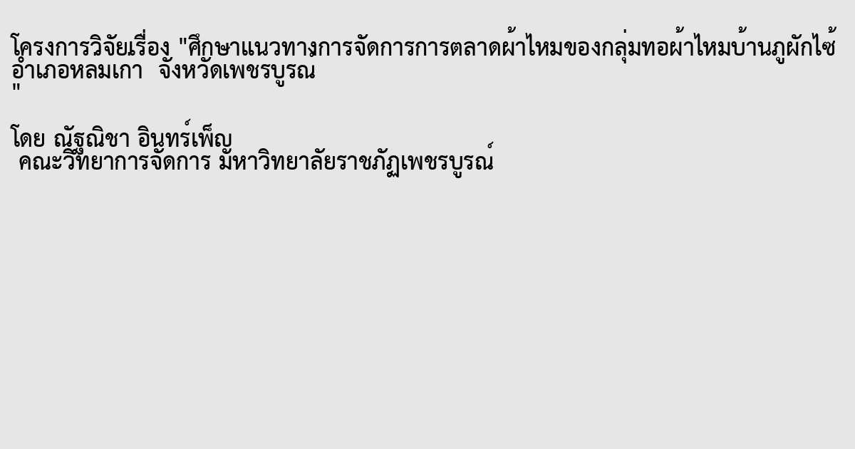 ศึกษาแนวทางการจัดการการตลาดผ้าไหมของกลุ่มทอผ้าไหมบ้านภูผักไซ้ อำเภอหล่มเก่า จังหวัดเพชรบูรณ์