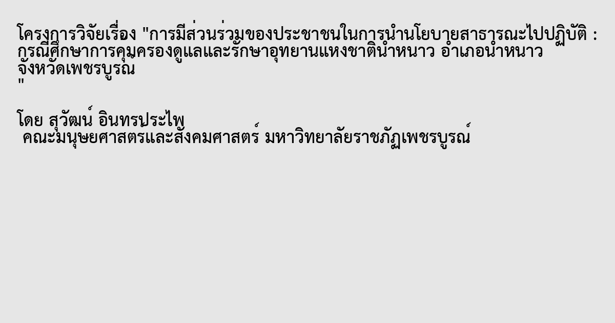 การมีส่วนร่วมของประชาชนในการนํานโยบายสาธารณะไปปฏิบัติ : กรณีศึกษาการคุ้มครองดูแลและรักษาอุทยานแห่งชาตินําหนาว อําเภอนําหนาว จังหวัดเพชรบูรณ์
