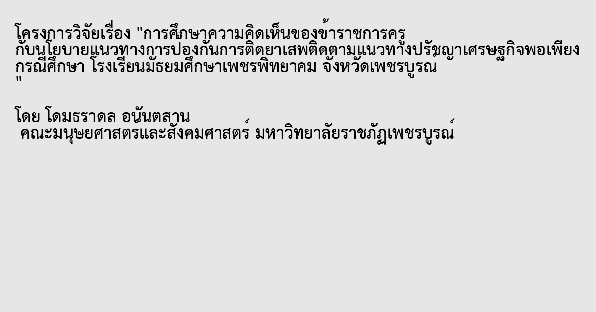 การศึกษาความคิดเห็นของข้าราชการครู กับนโยบายแนวทางการป้องกันการติดยาเสพติดตามแนวทางปรัชญาเศรษฐกิจพอเพียง กรณีศึกษา โรงเรียนมัธยมศึกษาเพชรพิทยาคม จังหวัดเพชรบูรณ์