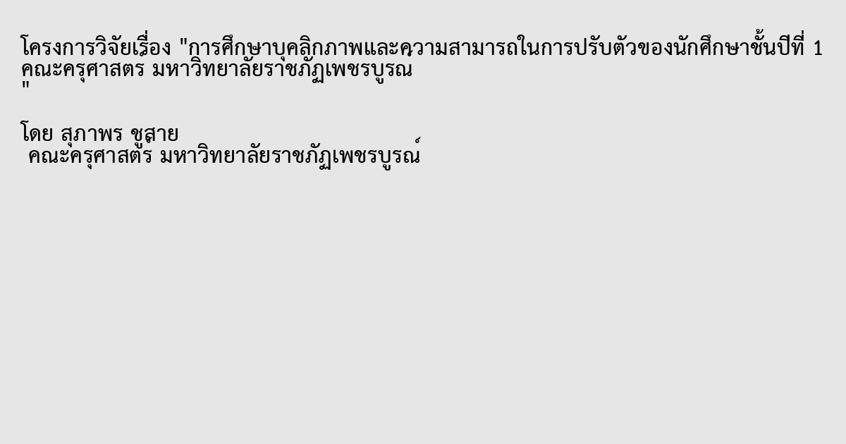 การวิจัยครั้งนี้มีวัตถุประสงค์ 1) เพื่อศึกษาบุคคลิกภาพของนักศึกษาคณะครุศาสตร์ ชั้นปีที่ 1 มหาวิทยาลัยราชภัฎเพชรบูรณ์ 2) เพื่อศึกษาระดับความสามารถในการปรับตัวของนักศึกษาคณะครุศาสตร์ ชั้นปีที่ 1 มหาวิทยาลัยราชภัฎเพชรบูรณ์ 3) เพื่อเปรียบเทียบความสามารถในการปรับตัวของนักศึกษาคณะครุศาสตร์ ชั้นปีที่ 1 มหาวิทยาลัยราชภัฎเพชรบูรณ์ ที่มีเพศ สาขาวิชา เกรดเฉลี่ย ที่พักอาศัย การได้รับการเลี้ยงดู และแหล่งเงินทุนในการเรียนที่แตกต่างกัน 4) เพื่อศึกษาความสัมพันธ์ระหว่างบุคคลิกภาพและความสามารถในการปรับตัวของนักศึกษาคณะครุศาสตร์ ชั้นปีที่ 1 มหาวิทยาลัยราชภัฏเพชรบูรณ์