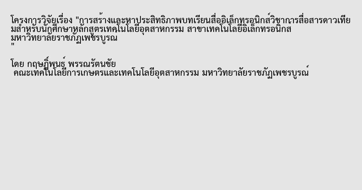 การสร้างและหาประสิทธิภาพบทเรียนสื่ออิเล็กทรอนิกส์วิชาการสื่อสารดาวเทียมสำหรับนักศึกษาหลักสูตรเทคโนโลยีอุตสาหกรรม สาขาเทคโนโลยีอิเล็กทรอนิกส์ มหาวิทยาลัยราชภัฏเพชรบูรณ์