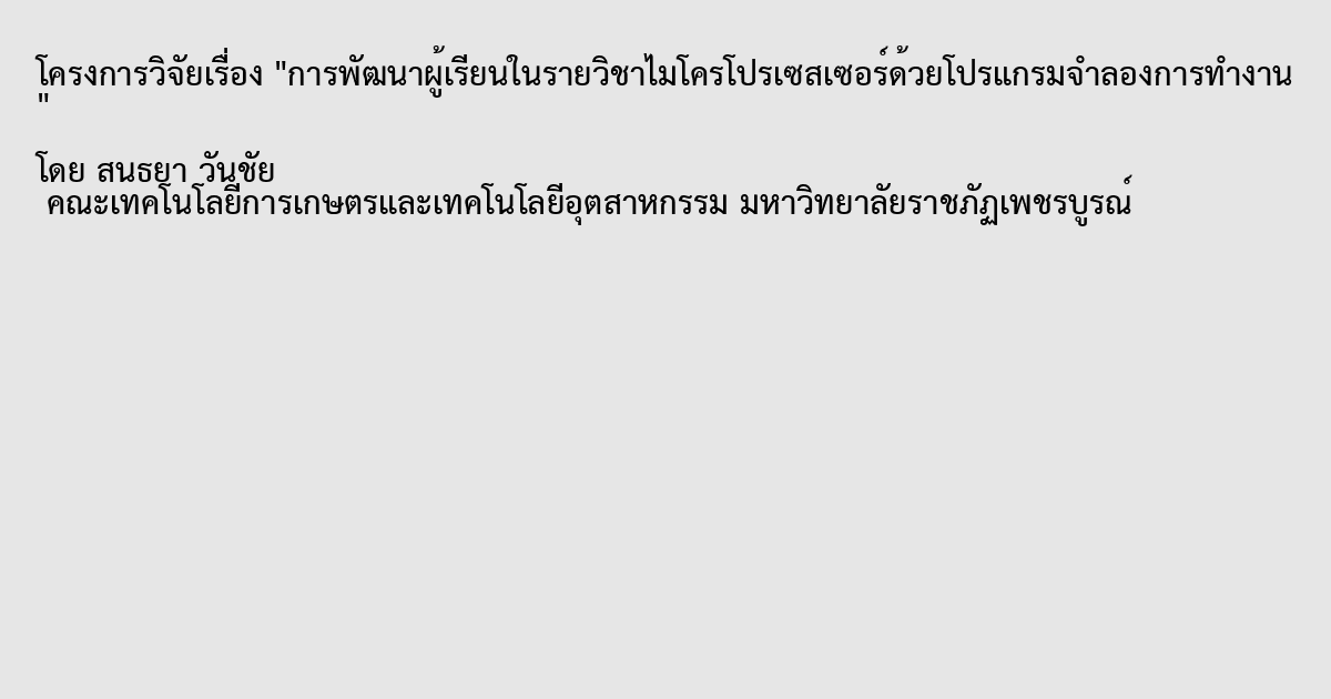 รายงานการวิจัยเรื่องการพัฒนาผู้เรียนในรายวิชาไมโครโปรเซสเซอร์ด้วยโปรแกรมจำลองการทำงาน มีวัตถุประสงค์ เพื่อศึกษาพัฒนาการผู้เรียนด้วยการใช้โปรแกรมจำลองในการสอนวิชาไมโครโปรเซสเซอร์และเพื่อประเมินความพึงพอใจผู้เรียนที่ใช้โปรแกรมจำลองในการสอนวิชาไมโครโปรเซสเซอร์ เครื่องมือที่ใช้ในการวิจัยได้แก่ โปรแกรมจำลองการทำงานไมโครโปรเซสเซอร์ Z80 จำนวน 1 ชุด ประกอบด้วยโปรแกรม Z80 Simulator IDE คู่มือการใช้งานและใบงานการเขียนโปรแกรมไมโครโปรเซสเซอร์ แบบประเมินผู้เรียนประกอบด้วยการประเมินก่อนและหลัง กลุ่มตัวอย่างที่ใช้ในการวิจัยคือนักศึกษาสาขาเทคโนโลยีอิเล็กทรอนิกส์ ชั้นปีที่2 จำนวน 13 คน และวิเคราะห์พัฒนาการของผู้เรียนโดยคำนวณค่าร้อยละ