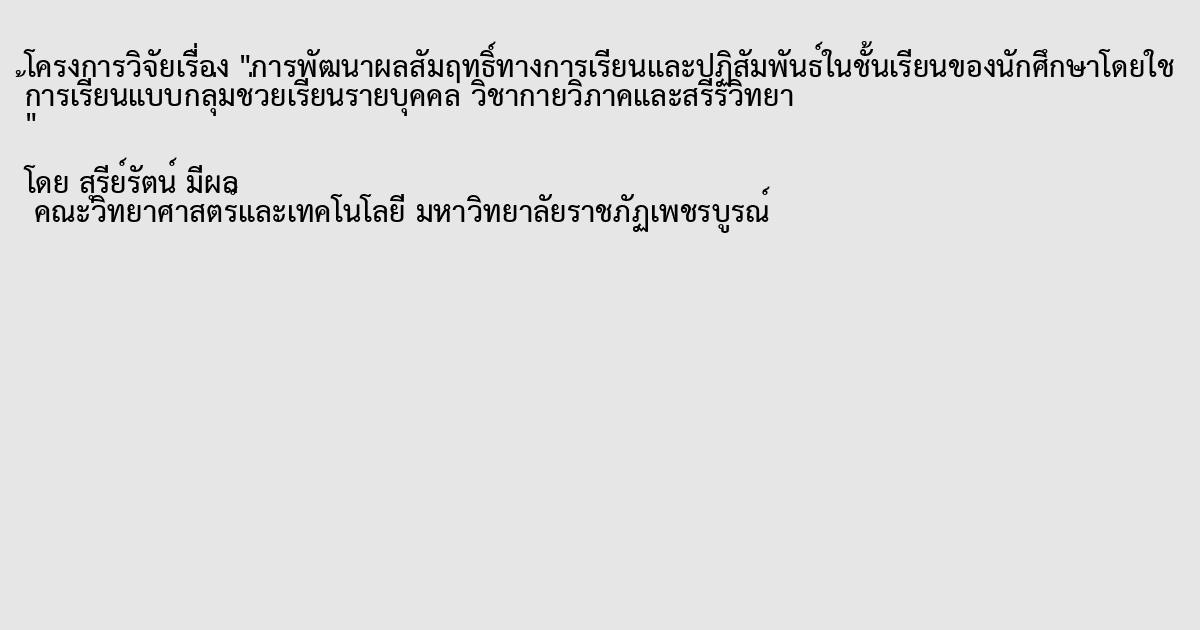 การศึกษาครั้งนี้มีวัตถุประสงค์ เพื่อศึกษาผลสัมฤทธิ์ทางการเรียนและปฏิสัมพันธ์ในชั้นเรียนของนักศึกษา โดยใช้การเรียนแบบกลุ่มช่วยเรียนรายบุคคล วิชากายวิภาคและเสรีวิทยา การทดสอบก่อนเรียนวิชากายวิภาคและเสรีวิทยา ได้ทดสอบวัดผลสัมฤทธิ์ทางการเรียนจากนักศึกษา 55 คน แสดงให้เห็นว่าคะแนนเฉลี่ยจากการทำแบบทดสอบก่อนเรียนเท่ากับ 21.0 ± 15.56 หลังจากเรียนด้วยการจัดกิจกรรมการเรียนการสอนที่เน้นผู้เรียนเป็นสำคัญ ปัญหาที่พบมากเป็นอันดับที่ 1 คือ เรื่องระบบกล้ามเนื้อ ปัญหาที่พบมากเป็นอันดับที่ 2 คือ เรื่องระบบประสาท และปัญหาที่พบมากเป็นอันดับที่ 3 คือ เรื่องระบบไหลเวียน เมื่อทราบปัญหาที่พบแล้วได้แก้ไขปัญหาโดยให้โอกาสนักศึกษาได้ทำงานตามความสามารถจากแบบฝึกหรือกิจกรรมที่ผู้สอนเตรียมให้ และเน้นส่งเสริมความร่วมมือภายในกลุ่ม เป็นการแลกเปลี่ยนประสบการณ์การเรียนรู้ซึ่งกันและกันเป็นวิธีการทำงานร่วมกัน ผลเป็นไปตามสมมติฐานที่ตั้งไว้ว่านักศึกษาที่เรียนเก่งจะมีผลสัมฤทธิ์ทางการเรียนวิชากายวิภาคและเสรีวิทยาสูงกว่า นักศึกษาที่เรียนอ่อนและปานกลาง และการมีปฏิสัมพันธ์ในชั้นเรียนของนักศึกษาช่วยให้ระบบผลการเรียนของนักศึกษาเฉลี่ยอยู่ในเกณฑ์ดี