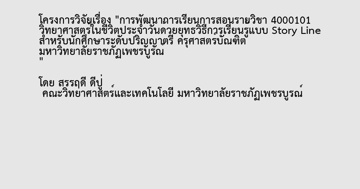 การพัฒนาการเรียนการสอนรายวิชา 4000101 วิทยาศาสตร์ในชีวิตประจำวันด้วยยุทธวิธีการเรียนรู้แบบ Story Line สำหรับนักศึกษาระดับปริญญาตรี ครุศาสตร์บัณฑิต มหาวิทยาลัยราชภัฏเพชรบูรณ์