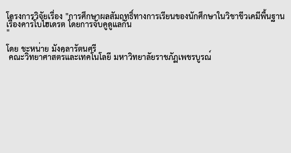 การวิจัยนี้มีจุดมุ่งหมายเพื่อศึกษาผลสัมฤทธิ์ทางการเรียนของนักศึกษาในวิชาชีวเคมีพื้นฐานเรื่องคาร์โบไฮเดรตโดยการจับคู่ดูแลกันและให้นักศึกษามีผลสัมฤทธิ์ทางการเรียนสูงขึ้น นักศึกษากลุ่มตัวอย่างคือ นักศึกษาสาขาวิทยาศาสตร์และเทคโนโลยีการอาหาร ชั้นปีที่ 2 หมู่เรียน 5411021031 จำนวน 8 คน ที่ลงทะเบียนเรียนรายวิชาชีวเคมีพื้นฐาน ในภาคเรียนที่ 1 ปีการศึกษา 2555 ให้นักศึกษาจับคู่ดูแลกันตามสมัครใจ ทำการศึกษา ทบทวน ทำความเข้าใจ ในเนื้อหาวิชาชีวเคมีพื้นฐาน เรื่อง คาร์โบไฮเดรต หลังเรียนวิชาชีวเคมีพื้นฐานตามตารางเรียนเป็นเวลา 4 ครั้งๆ 1 ชั่งโมง โดยให้นักศึกษาเกรดเฉลี่ยสูงคู่กับนักศึกษาเกรดเฉลี่ยต่ำ เครื่องมือที่ใช้ในการศึกษา ได้แก่ บทสรุป เนื้อหาวิชาชีวเคมีพื้นฐาน เรื่อง คาร์โบไฮเดรต แบบทดสอบผลสัมฤทธิ์ทางการเรียนเรื่องคาร์โบไฮเดรตและแบบบันทึกคะแนนเก็บสะสมทางการเรียนเรื่องต่างๆ วิเคราะห์ข้อมูลโดยใช้ค่าเฉลี่ยและค่าร้อยละ