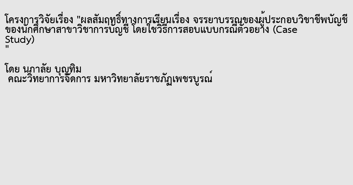 รายงานวิจัยเกี่ยวกับ ผลสัมฤทธิ์ทางการเรียน เรื่อง จรรยาบรรณของผู้ประกอบวิชาชีพบัญชีของนักศึกษาสาขาวิชาการบัญชี โดยใช้วิธากรสอนแบบกรณีตัวอย่าง มีวัตถุประสงค์เพื่อศึกษาผลสัมฤทธิ์ทางการเรียน เรื่อง จรรยาบรรณของผู้ประกอบวิชาชีพบัญชีของนักศึกษาสาขาวิชาการบัญชี โดยใช้การอนแบบกรณีตัวอย่าง ประชากรที่ใช้ในการวิจัย คือ นักศึกษาสาขาวิชาการบัญชี คณะวิทยาการจัดการมหาวิทยาลัยเพชรบูรณ์ ชั้นปีที่ 4 ในภาคเรียนที่ 1 ปีการศึกษา 2555 จำนวน 36 คนและวิเคราะห์ข้อมูลโดยคำนวณค่าร้อยละ