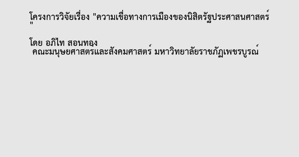 การศึกษานี้เป็นการศึกษาเชิงปริมาณ มีวัตถุประสงค์ คือ เพื่อศึกษาความเชื่อทางการเมืองของนิสิตรัฐประศาสนศาสตร์ มหาวิทยาลัยเพชรบูรณ์ และ เพื่อศึกษาอิทธิพลที่มีต่อความเชื่อทางการเมืองของนิสิตรัฐประศาสนศาสตร์ว่าสอดคล้องกับรูปแบบการเมืองแบบใด ประชากรที่ใช้ในภาควิชารัฐประศาสนศาสตร์ 160 คน เพศชาย 81 คน ร้อยละ 50.6 เพศหญิง 79 คน ร้อยละ 49.4 การศึกษาระหว่างวันที่ 1-10 สิงหาคม พ.ศ. 2555 สถิติที่ใช้ในการวิเคราะห์ข้อมูลเป็นสถิติเชิงพรรณนาได้แก่ ความถี่ (Frequency&Percentage)