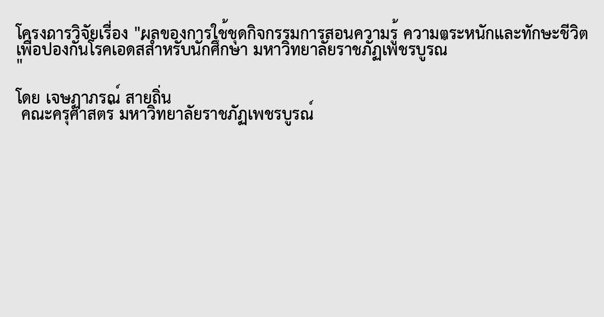 ผลของการใช้ชุดกิจกรรมการสอนความรู้ ความตระหนักและทักษะชีวิต เพื่อป้องกันโรคเอดส์สำหรับนักศึกษา มหาวิทยาลัยราชภัฏเพชรบูรณ์