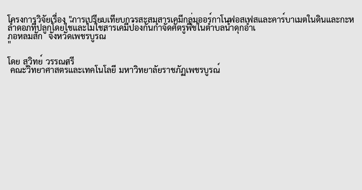 การเปรียบเทียบการสะสมสารเคมีกลุ่มออร์กาโนฟอสเฟสและคาร์บาเมตในดินและกะหล่ำดอกที่ปลูกโดยใช้และไม่ใช้สารเคมีป้องกันกำจัดศัตรูพืชในตำบลน้ำดุกอำเภอหล่มสัก จังหวัดเพชรบูรณ์