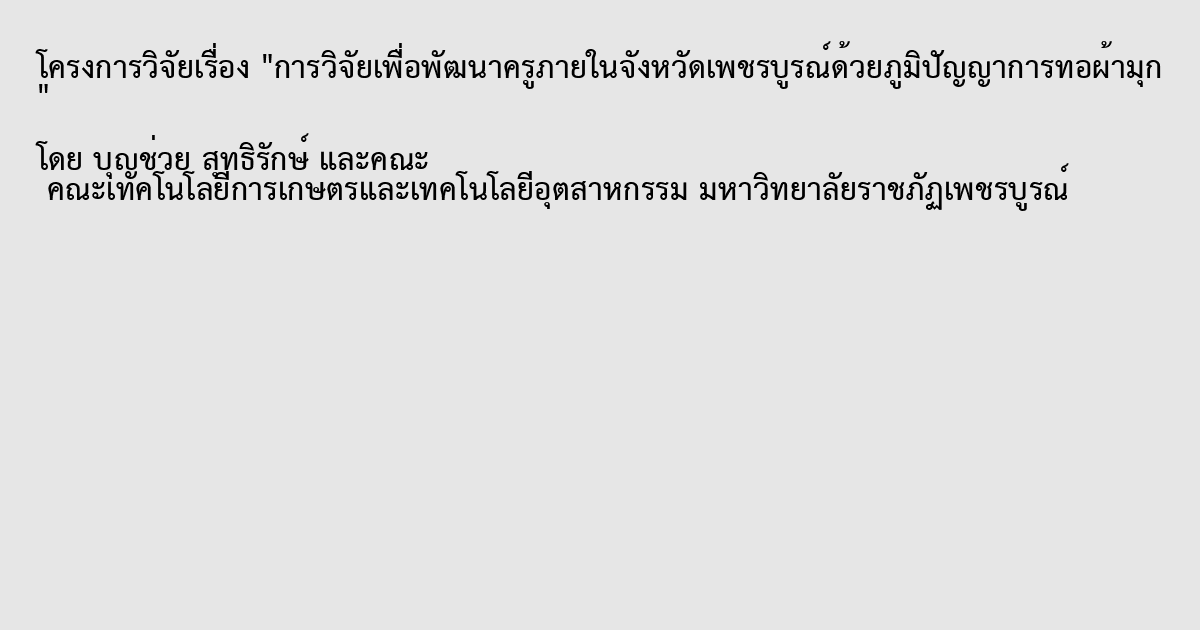 งานวิจัยนี้เป็นการศึกษาแนวทางการพัฒนาครูในจังหวัดเพชรบูรณ์ด้วยภูมิปัญญาการทอผ้ามุก เพื่อเป็นแนวทางปฏิรูปการศึกษา กระบวนการเรียนการสอน ทั้งในและนอกระบบตลอดจนการพัฒนาระบบการเรียนรู้ด้วยตนเอง ระบบสนับสนุนการเรียนรู้ที่สอดคล้องกับวิถีชีวิตใน ท้องถิ่นในขณะเดียวกันสามารถอนุรักษ์และสืบสานอัตลักษณ์ ตลอดจนภูมิปัญญาท้องถิ่นอย่างยั่งยืน จากการใช้ผลงานวิจัยโจทย์ปัญหาภูมิปัญญาท้องถิ่น และสร้างเครือข่ายการวิจัยภูมิปัญญาท้องถิ่น ที่มีประโยชน์ในการพัฒนาท้องถิ่นอย่างยั่งยืน ตลอดจนพัฒนาประเทศอย่างเป็นระบบ และมีคุณภาพ โดยสนับสนุนให้ชาวบ้านหรือตัวแทนในชุมชนเป็นคนสร้างองค์ความรู้ใหม่ให้กับตนเองและชุมชนด้วยการศึกษาเรียนรู้หาข้อมูลด้านภูมิปัญญาท้องถิ่นของชุมชนตนเอง โดยการร่วมกันวางแผนและกำหนดการดำเนินงานตามแผนหรือโครงการพร้อมทั้งการปฏิบัติตามแผนซึ่งเป็นการช่วยคุณลักษณะของการเรียนแบบพหุภาคีพร้อมกับก่อให้เกิดผลพลอยได้ที่เป็นจิตสำนึกตระหนักในปัญหาหน้าที่และร่วมกันอนุรักษ์และสืบสานภูมิปัญญาท้องถิ่นตลอดจนอัตลักษณ์ของกลุ่มตนเอง