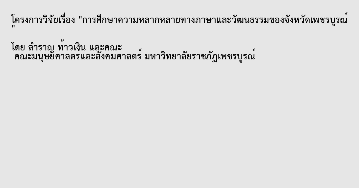 โลกยุคโลกาภิวัตน์ในปัจจุบันกำลังอยู่ในภาวะของการเปลี่ยนแปลงอย่างรวดเร็วเศรษฐกิจ สังคม การเมืองระหว่างประเทศและวัฒนธรรมสมัยใหม่มีอิทธิพลเป็นอย่างมากการสื่อสารมีพลังไร้พรมแดนเข้าถึงแม้ในพื้นที่ห่างไกลภาษาและวัฒนธรรมพื้น บ้านของชนกลุ่มเล็กกลุ่มน้อยอยู่ในภาวะอันตรายและเสี่ยงต่อการสูญสลายสถานการณ์เช่นนี้เป็นภัยคุกคามหลากหลายทางภาษาและวัฒนธรรมของกลุ่มชาติพันธุ์ต่างๆดังนั้นโครงการวิจัยนี้จึงมีวัตถุประสงค์เพื่อศึกษาความหลากหลายทางภาษาและวัฒนธรรมของกลุ่มชนต่างๆ พี่มาตั้งถิ่นฐานอยู่ในจังหวัดเพชรบูรณ์ในลักษณะการเรียนรู้แบบพหุภาคีพร้อมกับจัดทำฐานข้อมูลความหลากหลายทางภาษาและวัฒนธรรมของกลุ่มชนต่างๆที่มาตั้งถิ่นฐานอยู่ในจังหวัดเพชรบูรณ์โดยร่วมมือกับกลุ่มชนต่างๆในจังหวัดเพชรบูรณ์ในการดำเนินกิจการเพื่อฟื้นฟูภาษาและวัฒนธรรมตามความสนใจและความพร้อมของแต่ละชุมชนเสริมสร้างขีดความสามารถทักษะและเทคนิคในการจัดการความหลากหลายทางภาษาและวัฒนธรรมของทุกหน่วยงานต่างๆที่เกี่ยวข้องในจังหวัดเพชรบูรณ์เพื่ออนุรักษ์และสืบสานความหลากหลายทางภาษาและวัฒนธรรมตลอดจนอัตลักษณ์ของกลุ่ม ชนต่างๆในจังหวัดเพชรบูรณ์