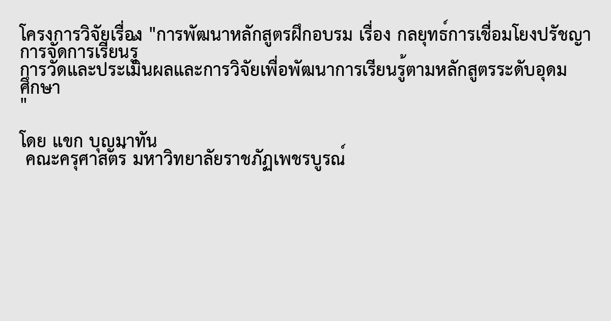 The purpose of this study is to study basis information, create training courses, try out the training courses and evaluate the training courses in strategy affect Philosophy, the administration learns, Measurement and Learning Evaluation and research for learning development according to under graduate education curriculum. The research composes of 4 processes. Process 1 study basic information to create training courses in strategy affect Philosophy, the administration learns, Measurement and Learning Evaluation and research for learning development according to under graduate education curriculum. The participants are 196 teachers of Phetchabun Rajabhat University in academic year of 2013. The size of sample group is set by Crassey and Morgan Tables and the sample groups are randomly chosen by using random range. The tool used in this process is questionnaires about basic information to create training courses in strategy affect Philosophy, the administration learns, Measurement and Learning Evaluation and research for learning development according to under graduate education curriculum. The linear value analyzed from IOC value is from 0.80-1.00 and reliability by using the alpha of coefficients of Cronbach is 0.8231. The researcher collected the data by himself, getting 150 questionnaires back considered as 76.53 %. The raw data is analyzed by using frequency and percentage and standard deviation and synthesizing the detail. Process 2 creation of training courses in strategy affect Philosophy, the administration learns, Measurement and Learning Evaluation and research for learning development according to under graduate education curriculum. The training courses in strategy affect Philosophy, the administration learns, Measurement and Learning Evaluation and research for learning development according to under graduate education curriculum are implemented by the researcher following the idea of Wichai Wongyai regarding to the concept of holistic course development. The course development processes are divided into 3 systems; course draft system, course trial system and course evaluation system. The detail used to create training courses in strategy affect Philosophy, the administration learns, Measurement and Learning Evaluation and research for learning development according to under graduate education curriculum is retrieved from synthesizing the information in Process 1. Process 3 The trial of training courses in strategy affect Philosophy, the administration learns, Measurement and Learning Evaluation and research for learning development according to under graduate education curriculum. The trial is done with 30 teachers of Phetchabun Rajabhat University in the second semester of academic year of 2013 by using purposive sampling as follows: recruiting teachers willing to join the research, interested and having time to participate in the research. The tools used in this process comprise of 2 types of tools; 1 training courses in strategy affect Philosophy, the administration learns, Measurement and Learning Evaluation and research for learning development according to under graduate education curriculum have 4 factors according to the idea of Taba; Objective, contents, learning experience and evaluation, and 2. Questionnaires for the comments about the training of training courses in strategy affect Philosophy, the administration learns, Measurement and Learning Evaluation and research for learning development according to under graduate education curriculum. The linear value is analyzed from IOC is from 0.80-1.00 and reliability by using the alpha of coefficient of Cronbach is 0.8023. This study uses One Group Post-Test Design; explain about the documents and activities to the participants, then organizes the training courses based on training courses in strategy affect Philosophy, the administration learns, Measurement and Learning Evaluation and research for learning development according to under graduate education curriculum, next sums up the scores from the performance of the participants after the training courses, and evaluate the outcome of the training courses by using the questionnaires asking for comments about the training courses based on training courses in strategy affect Philosophy, the administration learns, Measurement and Learning Evaluation and research for learning development according to under graduate education curriculum. The data is analyzed as follows ; 1 scores from activities of the participants and the evaluation outcome from the training evaluation form are analyzed to find the mean and standard deviation and the scores are compared with the rubrics by testing the average of 1 sample group. Process 4 Evaluation of training courses in strategy affect Philosophy, the administration learns, Measurement and Learning Evaluation and research for learning development according to under graduate education curriculum by collection data from 30 teachers of Phetchabun Rajabhat University in the academic year of 2013. Purposive sampling is used as follows; recruiting teachers willing to join the research, interested and having time to participate in the research. The tool used in this process is evaluation forms of training courses in strategy affect Philosophy, the administration learns, Measurement and Learning Evaluation and research for learning development according to under graduate education curriculum. The linear value is analyzed from IOC is from 0.80-1.00 and reliability by using the alpha of coefficient of Cronbach is 0.8154. The researcher collected the data on his own by distributing and receiving the questionnaires by himself on the last day of the training. The data is analyzed by using frequency, percentage, mean, standard deviation and synthesizing information. Conclusion of the study 1. The basic information to create training courses in strategy affect Philosophy, the administration learns, Measurement and Learning Evaluation and research 