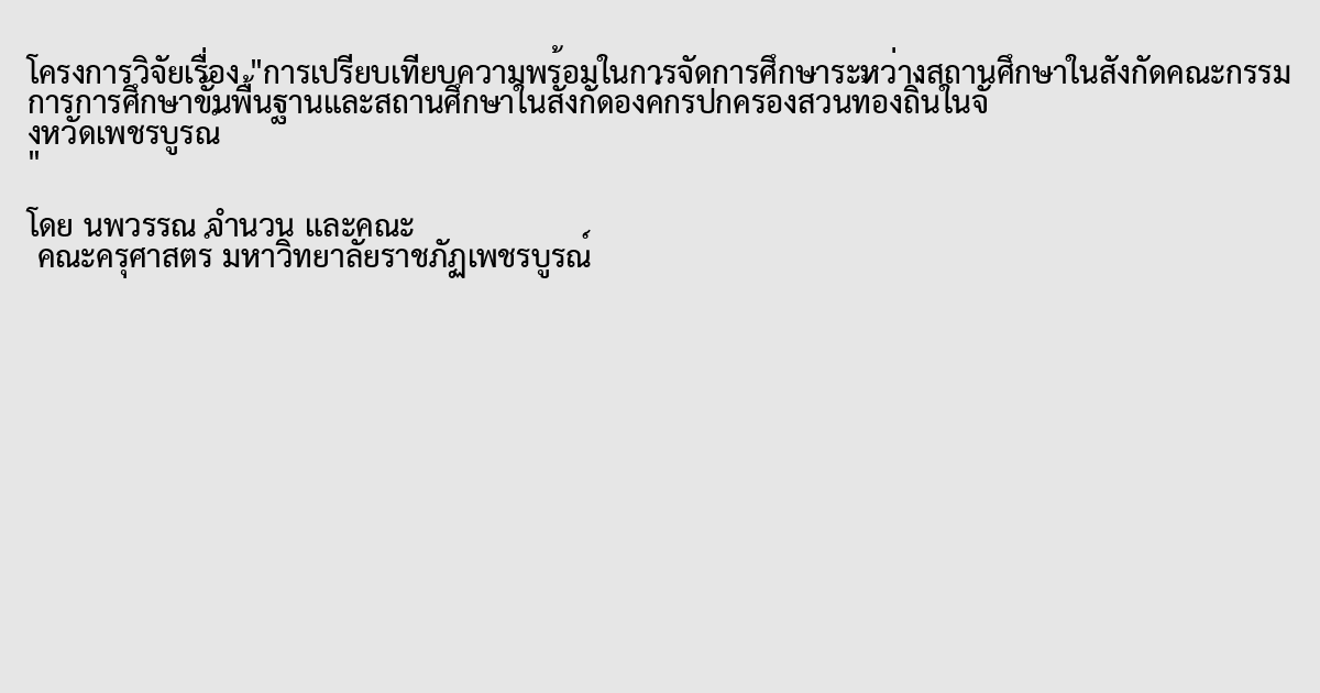 ตอนที่ 3 ผลการเปรียบเทียบความพร้อมของการจัดการศึกษาของโรงเรียนสังกัดสำนักงานคณะกรรมการการศึกษาขั้นพื้นฐานและโรงเรียนสังกัดองค์กรปกครองส่วนท้องถิ่น ด้านบริบท ด้านปัจจัยเบื้องต้น ด้านกระบวนการ และด้านผลผลิต ไม่ต่างกัน และในภาพรวมทุกด้านความพร้อมของการจัดการศึกษาของโรงเรียนสังกัดสำนักงานคณะกรรมการการศึกษาขั้นพื้นฐานและโรงเรียนสังกัดองค์กรปกครองส่วนท้องถิ่น ไม่ต่างกัน