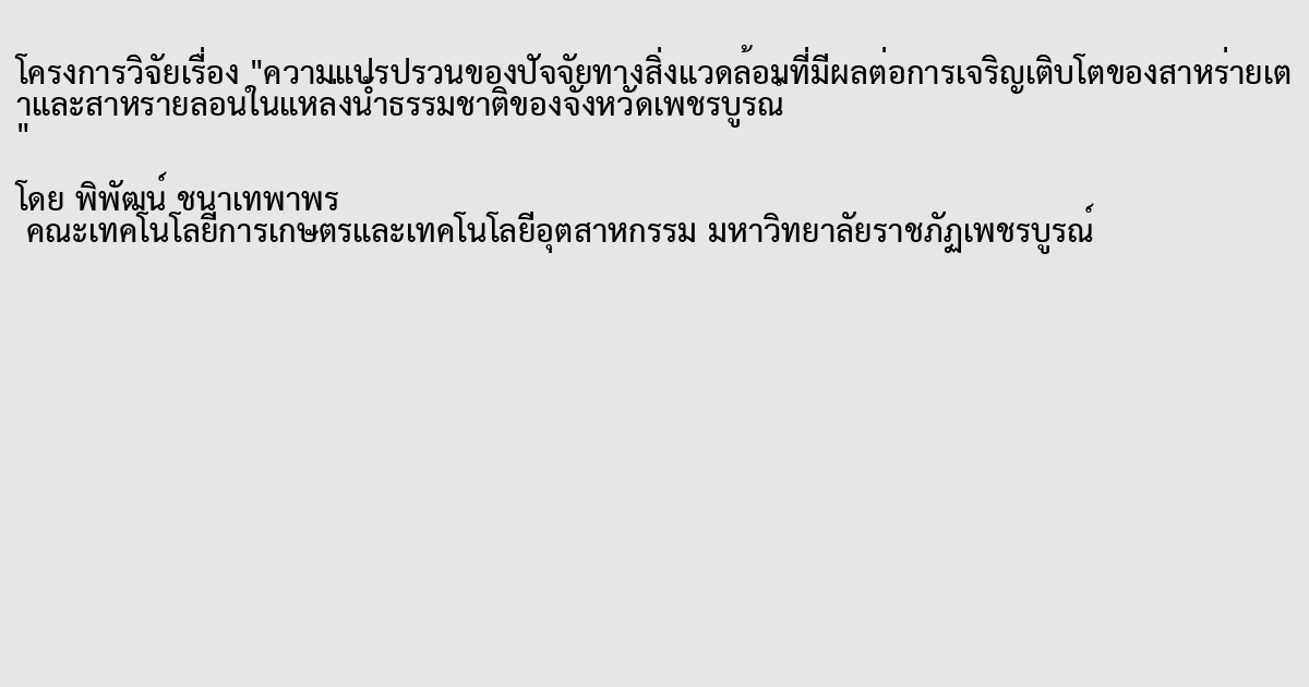 ความแปรปรวนของปัจจัยทางสิ่งแวดล้อมที่มีผลต่อการเจริญเติบโตของสาหร่ายเตาและสาหร่ายลอนในแหล่งน้ำธรรมชาติของจังหวัดเพชรบูรณ์