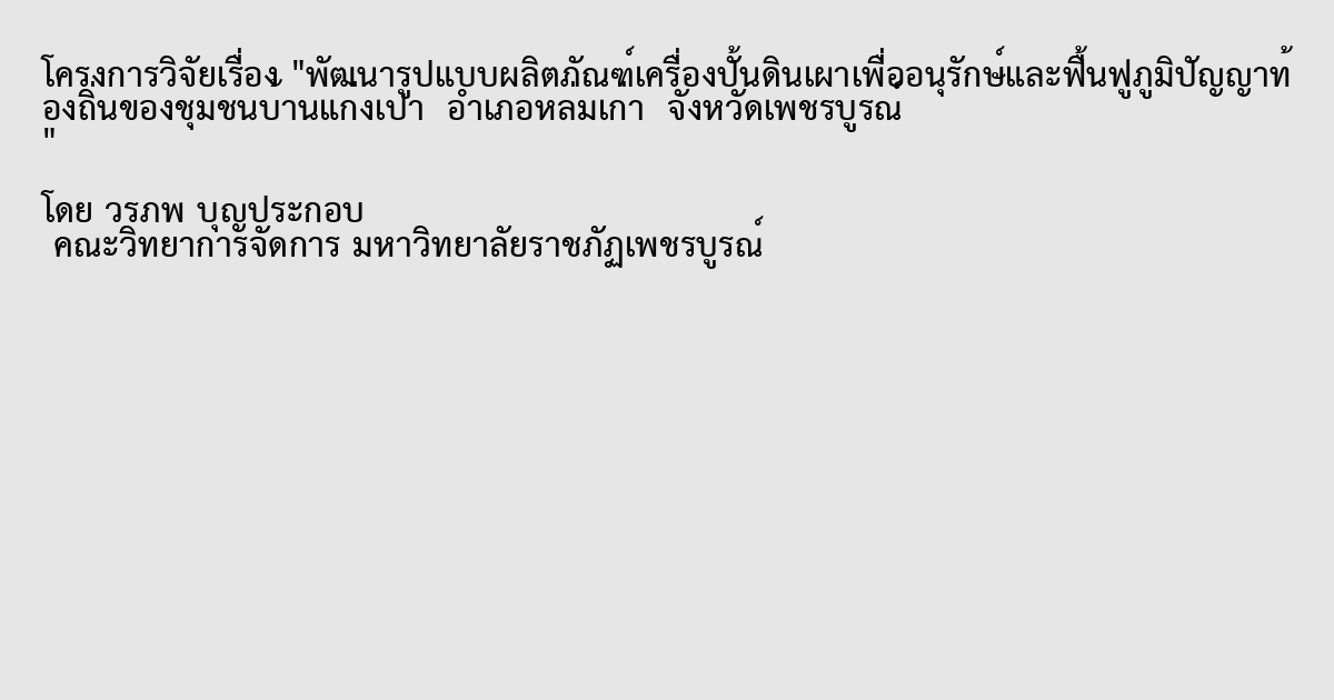 พัฒนารูปแบบผลิตภัณฑ์เครื่องปั้นดินเผาเพื่ออนุรักษ์และฟื้นฟูภูมิปัญญาท้องถิ่นของชุมชนบ้านแก่งเปา อำเภอหล่มเก่า จังหวัดเพชรบูรณ์