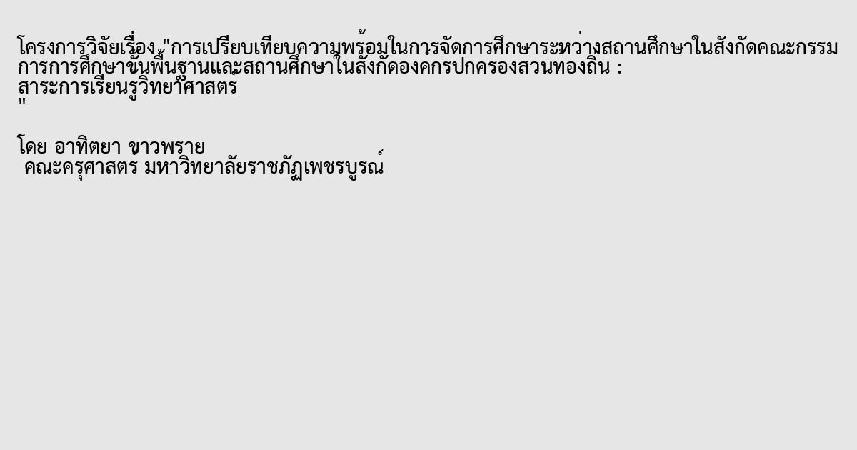 การเปรียบเทียบความพร้อมในการจัดการศึกษาระหว่างสถานศึกษาในสังกัดคณะกรรมการการศึกษาขั้นพื้นฐานและสถานศึกษาในสังกัดองค์กรปกครองส่วนท้องถิ่น : สาระการเรียนรู้วิทยาศาสตร์