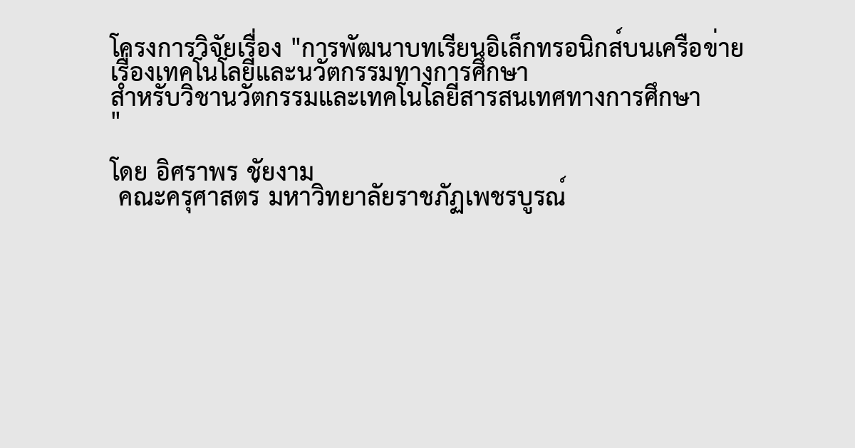 The objectives of this research were 1) to develop and find the effectiveness of e-Learning on Web for Information Technology System Course in Innovation and Educational Information Technology on criterion 85/85 2) to compare the pretest and the posttest scores from the e-Learning on Web for Information Technology System Course in Innovation and Educational Information Technology and 3) to study the satisfaction of the students towards the e-Learning on Web for Information Technology System Course in Innovation and Educational Information Technology. The samples were 30 second year students majoring in Career and Technology in Education Faculty and were studying The Course Learning Innovation and Educational Information Technology in the first semester of the academic year 2013 at Phetchabun Rajabhat University. The research instruments were the e-Learning on Web for Innovation and Educational Information Technology, the Achieve went test and the satisfaction Questionnaire The data were analyzed by using percentage , mean , standard deviation and t-test. The results were as in the following : 1) The efficiency of the e-Learning on Web for Innovation and Educational Information Technology was at 87.63/86.88 which was higher thorn the criterion 2) The posttest scores of students were higher than the pretest scores at the statistically significant level of .01 The students’ satisfaction towards to the e-Learning on Web for Innovation and Educational Information Technology was at the highest level.