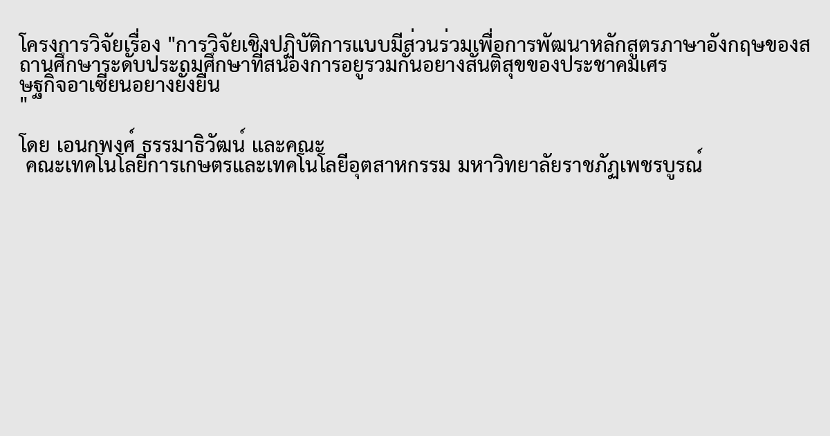 การวิจัยเชิงปฏิบัติการแบบมีส่วนร่วมเพื่อการพัฒนาหลักสูตรภาษาอังกฤษของสถานศึกษาระดับประถมศึกษาที่สนองการอยู่ร่วมกันอย่างสันติสุขของประชาคมอาเซียนอย่างยั่งยืน มีวัตถุประสงค์การวิจัย เพื่อการศึกษาสภาพปัญหาและอุปสรรคในการจักการเรียนการสอนเป็นภาษาอังกฤษตามหลักสูตรสถานศึกษาระดับประถมศึกษาในเขตพื้นที่การศึกษาเพชรบูรณ์ และเพื่อหาแนวทางในการพัฒนาหลักสูตรรายวิชาคณิตศาสตร์ เป็นภาษาอังกฤษของสถานศึกษาระดับประถมศึกษาที่สนองการอยู่ร่วมกันอย่างสันติสุขของประชาคมอาเซียนอย่างยั่งยืนโดยใช้กระบวนการการวิจัยเชิงปฏิบัติการแบบมีส่วนร่วม ผู้ตอบแบบสอบถาม ได้แก่ ผู้บริหาร 8 คน และครู 36 คน รวม 44 คน เครื่องมือที่ใช้ในการวิจัยคือ แบบสอบถามและแบบศึกษาเอกสาร วิเคราะห์ข้อมูลโดยการแจกแจงความถี่ หาค่าร้อยละ และวิเคราะห์เนื้อหา