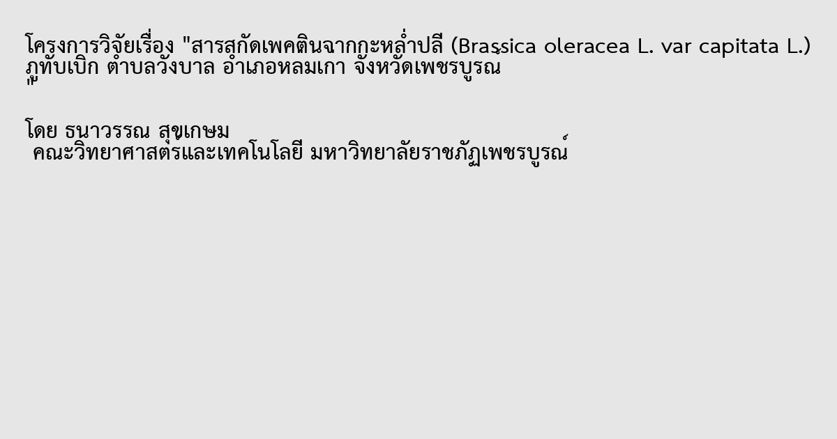 การวิจัยครั้งนี้มีจุดมุ่งหมายเพื่อทำการศึกษาสภาวะการสกัดเพคตินจากกะหล่ำปลีจากภูทับเบิก โดยทำการสกัดเพคตินด้วยกรด 2 ชนิด ได้แก่ กรดไฮโดรคลอริก และกรดไนตริก ความเข้มข้น 1 นอร์มอล อุณห๓มิที่ใช้ในการสกัด 3 ระดับ คือ 80 90 และ 100 องศาเซลเซียส และเวลาที่ใช้ในการสกัด 3 ระยะ คือ 30 60 และ 100 องสสาเซลเซียส พบว่าเพคตินที่สกัดด้วยกรดไฮโดรคลอริกที่อุณหภูมิ 90 เป็นเวลา 90 นาที พบว่าจะมีปริมาณน้ำหนักแห้งของเพคตินสูงที่สุด เท่ากับ 0.79 กรัม ต่อกะหล่ำปลี 5 กรัม หรือประมาณร้อยละ 15.8จากนั้นนำเพคตินที่สกัดได้ไปวิเคราะห์คุณสมบัติทางกายภาพและทางเคมี พบว่าสารสกัดเพคตินที่สกัดได้ดีที่สุด คือ เพคตินที่สกัดด้วยกรดไนตริก ( HNO3 ) เข้มข้น 1 นอร์มอล ที่อุณหภูมิ 90 องศาเซลเซียส เป็นเวลา 90 นาที จะมีลักษณะเป็นของแข็งสีขาวขุ่น ละลายน้ำได้ดี และเกิดเจลได้เมื่อนำไปละลายน้ำ และจะมีปริมาณร้อยละผลผลิตที่ได้ , ร้อยละความชื้น ,ปริมาณเมธอกซี , น้ำหนักสมมูล , เปอร์เซ็นต์ DE และมิลลิกรัมของกรดกาแลกทูโรนิก (%) มีค่าเท่ากับ 0.70±0.14 - 12.00±0.57 , 1.17±0.23 - 20.00±0.95 , 4.12±0.02 - 7.44±0.02 , 432.03±0.43 - 900.36±1.87 , 51.89±0.03 - 53.33±0.07 , 463.74±1.48 - 794.19±0.74 ตามลำดับ