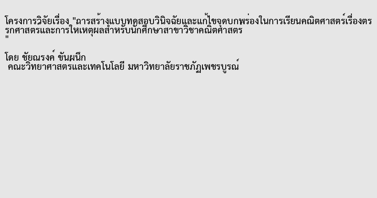 การสร้างแบบทดสอบวินิจฉัยและแก้ไขจุดบกพร่องในการเรียนคณิตศาสตร์เรื่องตรรกศาสตร์และการให้เหตุผลสำหรับนักศึกษาสาขาวิชาคณิตศาสตร์ เพื่อเปรียบเทียบผลสัมฤทธิ์ทางการเรียน เรื่องตรรกศาสตร์และการให้เหตุผล สำหรับนักศึกษาสาขาวิชาคณิตศาสตร์ คณะวิทยาศาสตร์และเทคโนโลยี มหาวิทยาลัยราชภัฏเพชรบูรณ์ โดยใช้กระบวนการแก้ปัญหาและวินิจฉัยข้อบกพร่องการเรียนรู้(Problem solving and Diagnostics) สาระการให้เหตุผลแบบอุปนัย สาระการให้เหตุผลแบบนิรนัย และสาระการให้เหตุผลด้วยหลักตรรกศาสตร์