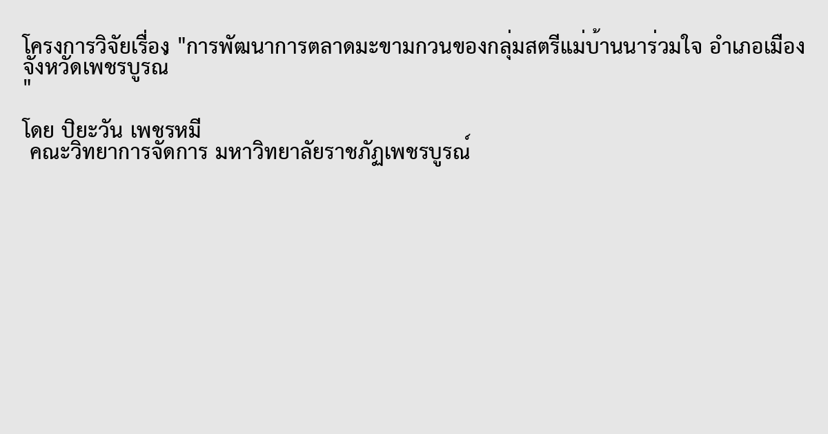 การวิจัย เรื่องการพัฒนาการตลาดมะขามกวนของกลุ่มสตรีแม่บ้านนาร่วมใจ อำเภอเมือง จังหวัดเพชรบูรณ์ มีวัตถุประสงค์เพื่อพัฒนาการตลาดสินค้าหนึ่งตำบลหนึ่งผลิตภัณฑ์ ของกลุ่มสตรีแม่บ้านนาร่วมใจ อำเภอเมืองจังหวัดเพชรบูรณ์ และเพื่อเพิ่มขีดความสามารถในการแข่งขันทางด้านการค้าสินค้าหนึ่งตำบลหนึ่งผลิตภัณฑ์ และสร้างเอกลักษณ์สินค้าท้องถิ่น ซึ่งในการวิจัยครั้งนี้ได้มีการดำเนินการวิจัยกับกลุ่มสตรีแม่บ้านนาร่วมใจ ซึ่งมีสมาชิก 21 คนในการวิจัยมีวิธีการวิจัยคือ มีการประชุมกลุ่มสมาชิกเพื่อสำรวจสภาพปัญหาของผลิตภัณฑ์จัดอบรมด้านการตลาดให้กลุ่มสมาชิกโดยผู้เชี่ยวชาญ ศึกษาดูงาน พัฒนาผลิตภัณฑ์ และทำการทดสอบตลาดซึ่งกลุ่มตัวอย่างที่ใช้ในการวิจัย คือ กลุ่มวิสาหกิจชุมชนแปรรูปมะขามหวานอำเภอเมืองจังหวัดเพชรบูรณ์ จำนวน 10 กลุ่ม ผู้ใช้แบบสอบถามโดยแบ่งแบบสอบถามเป็น 3 ส่วน คือ ส่วนที่ 1 เป็นแบบสอบถามข้อมูลทั่วไปของวิสาหกิจชุมชน ส่วนที่ 2 ข้อมูลช่องทางการจำหน่ายผลิตภัณฑ์มะขามหวานแปรรูปของวิสาหกิจชุมชน ส่วนที่ 3 ปัญหาและอุปสรรคในการจำหน่ายผลิตภัณฑ์มะขามหวานแปรรูปของวิสาหกิจชุมชน และวิเคราะห์สถิติพื้นฐาน ได้แก่ ร้อยละ(Percentage) ความถี่ (Frequency) ค่าเฉลี่ย (Mean) และการจัดเรียงลำดับความมากน้อย (Rating Scale)