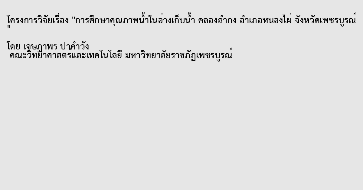 การศึกษาคุณภาพน้ำในอ่างเก็บน้ำ คลองลำกง อำเภอหนองไผ่ จังหวัดเพชรบูรณ์ ทำการวิเคราะห์คุณภาพน้ำ 3 ลักษณะ คือลักษณะทางกายภาพ เคมีและชีววิทยา โดยเก็บตัวอย่างน้ำจากแหล่งน้ำผิวดิน 4 จุด ได้แก่ จุดเก็บตัวอย่างที่1 (LK1) บริเวณเหนือเขื่อนทางทิศเหนือ จุดเก็บตัวอย่างที่ 2 (LK2) บริเวณเหนือเขื่อนทางทิศใต้ จุดเก็บตัวอย่างที่ 3 (LK3) บริเวณที่มีการสร้างที่อยู่อาศัยและจุดเก็บตัวอย่างที่ 4 (LK4) บริเวณกลางอ่างทางทิศตะวันออก