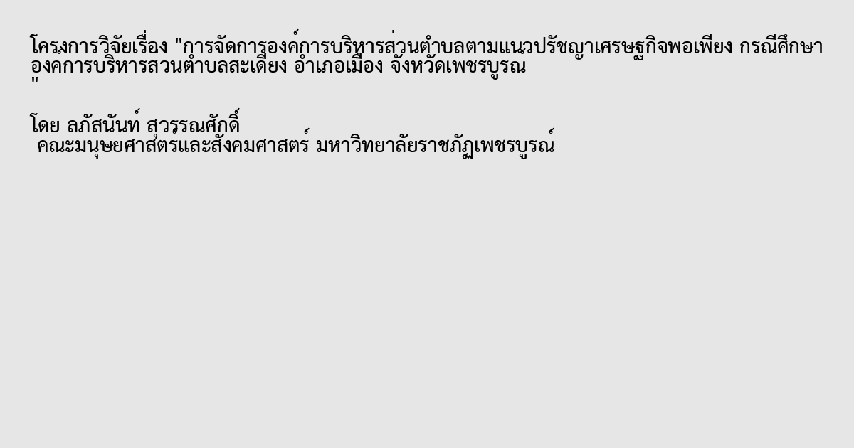 การจัดการองค์การบริหารส่วนตำบลตามแนวปรัชญาเศรษฐกิจพอเพียง กรณีศึกษา องค์การบริหารส่วนตำบลสะเดียง อำเภอเมือง จังหวัดเพชรบูรณ์