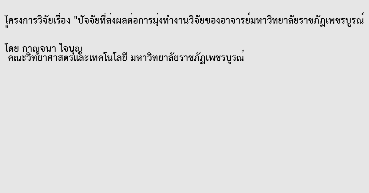 งานวิจัยครั้งนี้มีจุดมุงหมายเพื่อศึกษาปจจัย 5 ดาน ไดแก ดานความเปนนักวิจัย ดาน สมรรถนะการวิจัย ดานแหลงขอมูลการวิจัย ดานคุณลักษณะของสถานศึกษา และดานแหลงทุน สนับสนุนการวิจัย และเพื่อเปรียบเทียบปจจัยที่สงผลตอการมุงทํางานวิจัยของอาจารยมหาวิทยาลัย ราชภัฏเพชรบูรณจําแนกตามดานความเปนนักวิจัย ดานสมรรถนะการวิจัย ดานแหลงขอมูลการวิจัย ดานคุณลักษณะของสถานศึกษา และดานแหลงทุนสนับสนุนการวิจัย กลุมตัวอยางเปนเพศหญิง รอยละ 52.15 เพศชาย รอยละ 47.85 มีอายุเฉลี่ย 40.29 ป และ สวนใหญมีอายุระหวาง 27-34 ป รอยละ 32.26 รองลงมา มีอายุระหวาง 35-42 ป รอยละ 28.49 อายุระหวาง 43-50 ป รอยละ 26.34 และอายุระหวาง 51-58 ป รอยละ 12.90 สวนใหญ มีสถานภาพโสด รอยละ 74.19 และมีสถานภาพสมรส รอยละ 25.81 สวนใหญ มีการศึกษา ระดับปริญญาโท รอยละ 95.16 รองลงมา มีการศึกษาปริญญาเอก รอยละ 4.30 และ มีการศึกษา ระดับปริญญาตรี รอยละ 0.54 สวนใหญมีรายไดเฉลี่ยตอเดือนอยูระหวาง 20,001 - 30,000 บาท รอยละ 54.84 รองลงมา มีรายไดเฉลี่ยตอเดือนอยูระหวาง 30,001 - 40,000 บาท รอยละ 22.58 อยูระหวาง 10,001 - 20,000 บาท รอยละ 9.68 อยูระหวาง 40,001 – 50,000 บาท รอยละ 9.14 มีรายไดเฉลี่ยตอเดือนตั้งแต 50,001 บาท ขึ้นไป รอยละ 3.23 และมีรายไดเฉลี่ยตอเดือนต่ํา กวาหรือเทากับ 10,000 บาท รอยละ 0.54 สวนใหญมีตําแหนงทางวิชาการเปนอาจารย รอยละ 93.01 รองลงมาเปนผูชวยศาสตราจารย รอยละ 6.45 เปนรองศาสตราจารย รอยละ 0.54 สวน ใหญสังกัดคณะมนุษยศาสตรและสังคมศาสตร รอยละ 30.65 รองลงมา สังกัดคณะวิทยาศาสตร และเทคโนโลยี รอยละ 22.04 สังกัดคณะเทคโนโลยีเกษตร รอยละ 19.35 สังกัดคณะวิทยาการ จัดการ รอยละ 17.20 และสังกัดคณะครุศาสตร รอยละ 10.75 ผลการวิจัยแสดงใหเห็นวาอาจารยของมหาวิทยาลัยราชภัฏเพชรบูรณ มีสภาพความเปนจริง ในการมุงทํางานวิจัยอยูในระดับปานกลาง แตมีความคาดหวังในการมุงทํางานวิจัยในระดับมาก อาจารยในมหาวิทยาลัยราชภัฏเพชรบูรณที่มีเพศตางกัน มีสภาพความเปนจริงในการมุงทํางานวิจัย โดยภาพรวมไมแตกตางกันและรายดานแตกตางกัน ยกเวนดานความเปนนักวิจัย ดานสมรรถนะการ วิจัย และดานแหลงทุนสนับสนุนการวิจัยไมแตกตางกัน และสภาพความคาดหวังในการมุงทํางานวิจัย ของอาจารยในมหาวิทยาลัยราชภัฏเพชรบูรณที่มีเพศตางกัน มีสภาพความคาดหวังในการมุงทํางาน วิจัย โดยภาพรวมและรายดานไมแตกตางกัน สวนอาจารยในมหาวิทยาลัยราชภัฏเพชรบูรณที่มีอายุ สถานภาพระดับการศึกษา รายไดเฉลี่ยตอเดือน ตําแหนงทางวิชาการ และคณะที่สังกัดตางกันมี สภาพความเปนจริงและสภาพความคาดหวังในการมุงทํางานวิจัย โดยภาพรวมและรายดานไม แตกตางกันอยางมีนัยสําคัญทางสถิติที่ระดับ .05