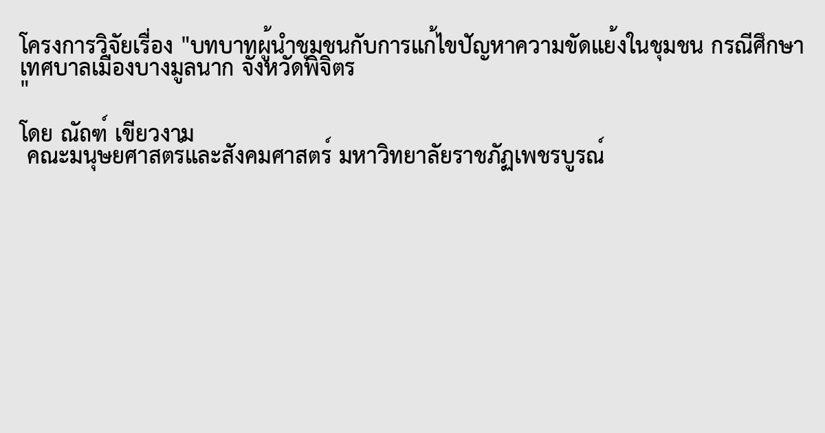 การวิจัย เรื่อง “ บทบาทผู้นำชุมชนกับการแก้ไขปัญหาความขัดแย้งในชุมชน : กรณีศึกษาเทศบาลเมืองบางมูลนาก จังหวัดพิจิตร มีวัตถุประสงค์การวิจัย คือ 1) เพื่อศึกษาถึงบทบาทผู้นำชุมชนในการแก้ไขปัญหาความขัดแย้งในชุมชน 2) เพื่อการศึกษาปัญหาและอุปสรรคของผู้นำชุมชนในการแก้ไขปัญหาความขัดแย้งในชุมชน 3) เพื่อเสนอแนะแนวทางการแก้ไขปัญหาความขัดแย้งในชุมชนของผู้นำชุมชนให้มีประสิทธิผลมากยิ่งขึ้น