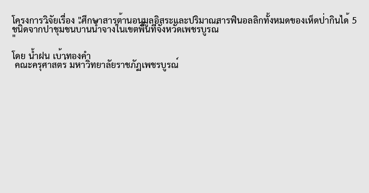 ศึกษาสารต้านอนุมูลอิสระและปริมาณสารฟินอลลิกทั้งหมดของเห็ดป่ากินได้ 5 ชนิดจากป่าชุมชนบ้านน้ำจางในเขตพื้นที่จังหวัดเพชรบูรณ์