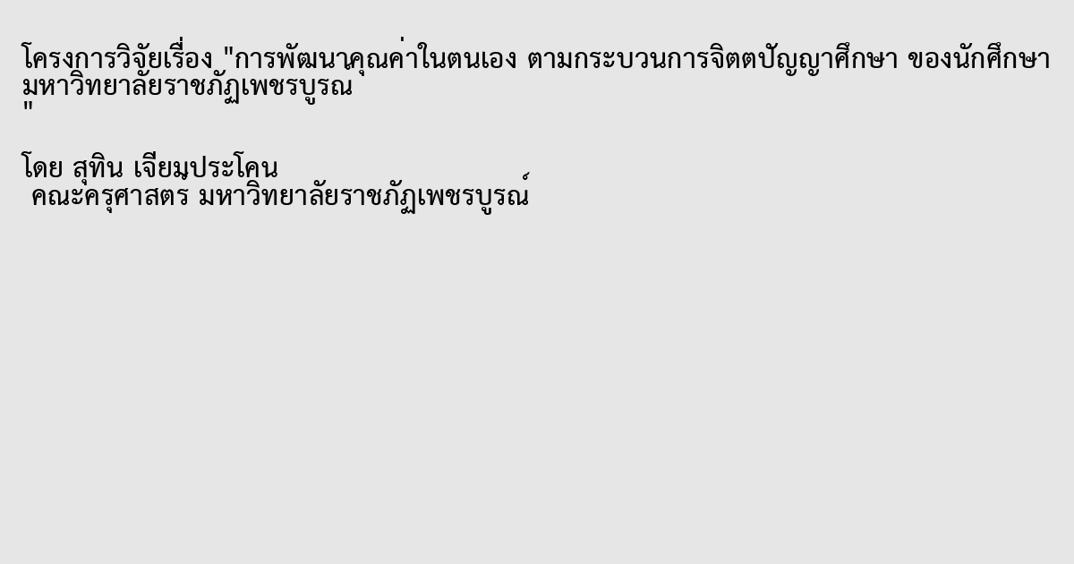 การวิจัยครั้งนี้มีวัตถุประสงค์เพื่อศึกษาความต้องการของนักศึกษาเกี่ยวกับการพัฒนาคุณค่าในตนเอง ตามกระบวนการจิตปัญญา ของนักศึกษามหาวิทยาลัยราชภัฏเพชรบูรณ์