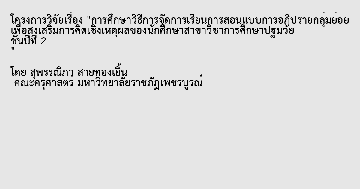 การวิจัยครังนีเป็ นการพัฒนาทดลอง (experimental development)โดยมีวัตถุประสงค์ เพือศึกษาการคิดเชิงเหตุผลในรายวิชาการจัดการศึกษาและโปรแกรมเพือพัฒนาเด็กบริบาล ทัง ก่อนและหลังการจัดการเรียนการสอนแบบการอภิปรายกลุ่มย่อยและเพือศึกษาความพึงพอใจ ของนักศึกษาทีได้รับการจัดการเรียนการสอนแบบการอภิปรายกลุ่มย่อยโดยกลุ่มตัวอย่างทีใช้ใน การศึกษาครังนี เป็ นนักศึกษาสาขาวิชาการศึกษาปฐมวัย คณะครุ ศาสตร์ มหาวิทยาลัยราชภัฏ เพชรบูรณ์ ทีกําลังศึกษาอยู่ชั นปี ที 2/1 ภาคเรียนที 1 ปี การศึกษา 2556จํานวน 32 คน เครืองมือทีใช้ ในการจัดกิจกรรมครังนีคือ 1. แผนการจัดการเรี ยนการสอนแบบการอภิปรายกลุ่มย่อย 2.แบบทดสอบวัดการคิดเชิงเหตุผลและ 3. แบบประเมินความพึงพอใจของนักศึกษา ซึงสถิติทีใช้ ในการวิเคราะห์ข้อมูล คือ ค่าเฉลีย ค่าร้อยละ และค่าเบียงเบนมาตรฐาน ผลการวิเคราะห์ข้อมูล พบว่า 1. การศึกษางานวิจัยเรือง การจัดการเรียนการสอนให้กับนักศึกษาปี ที2โดยใช้รูปแบบ วิธีการจัดการเรียนการสอนแบบการอภิปรายกลุ่มย่อยพบว่าหลังการจัดกิจกรรมนักศึกษามี ทักษะการคิดเชิงเหตุผลสูงขึนซึงผลการทดสอบก่อนเรียนมีผลค่าคะแนนคิดเป็ นร้อยละ 36.40และ หลังการจัดการเรี ยนการสอนแบบการอภิปรายกลุ่มย่อย มีค่าคะแนนโดยคิดเป็ นร้อยละ 79.00 ส่งผลให้ผลความต่างของคะแนนระหว่างก่อนและหลังมีความเปลียนแปลงเพิ มมากขึนกว่าก่อนการ จัดกิจกรรมโดยคิดเป็ นร้อยละ42.60 ซึงสอดคล้องกับสมมุติฐานทีตั งไว้ 2. ผลความพึงพอใจของนักศึกษาทีได้รับการจัดจัดการเรียนการสอนแบบการอภิปราย กลุ่มย่อย พบว่าภาพรวมของทุกข้อทีทําการประเมินนักศึกษามีผลความพึงพอใจโดยคิดเป็ นค่าเฉลีย อยู่ที 4.15 ซึงจัดอยู่ในระดับมากโดยมีความสอดคล้องกับสมมุติฐานทีตั งไว้