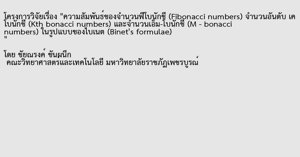 ความสัมพันธ์ของจำนวนฟีโบนักชี (Fibonacci numbers) จำนวนอันดับ เค โบนักชี (Kth bonacci numbers) และจำนวนเอ็ม-โบนักชี (M - bonacci numbers) ในรูปแบบของไบเนต (Binet's formulae)