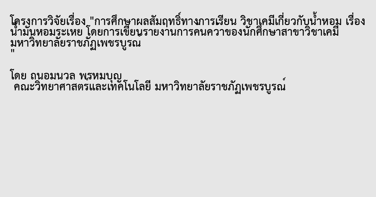 การศึกษาผลสัมฤทธิ์ทางการเรียน วิชาเคมีเกี่ยวกับน้ำหอม เรื่อง น้ำมันหอมระเหย โดยการเขียนรายงานการค้นคว้าของนักศึกษาสาขาวิชาเคมี มหาวิทยาลัยราชภัฏเพชรบูรณ์