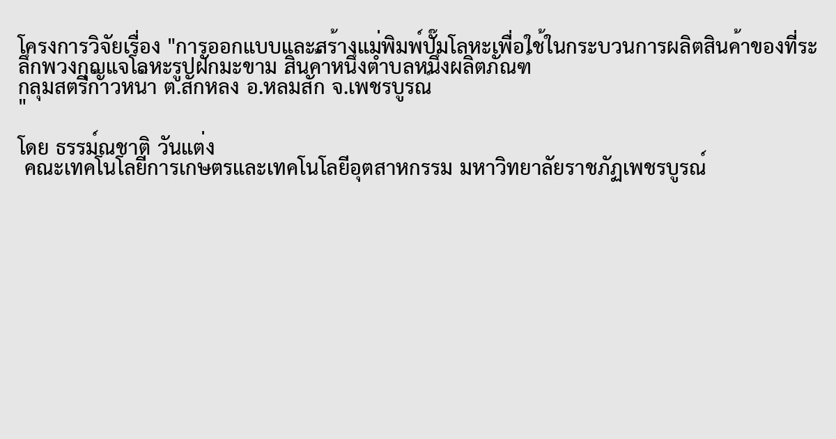 การออกแบบและสร้างแม่พิมพ์ปั๊มโลหะเพื่อใช้ในกระบวนการผลิตสินค้าของที่ระลึกพวงกุญแจโลหะรูปฝักมะขาม สินค้าหนึ่งตำบลหนึ่งผลิตภัณฑ์ กลุ่มสตรีก้าวหน้า ต.สักหลง อ.หล่มสัก จ.เพชรบูรณ์
