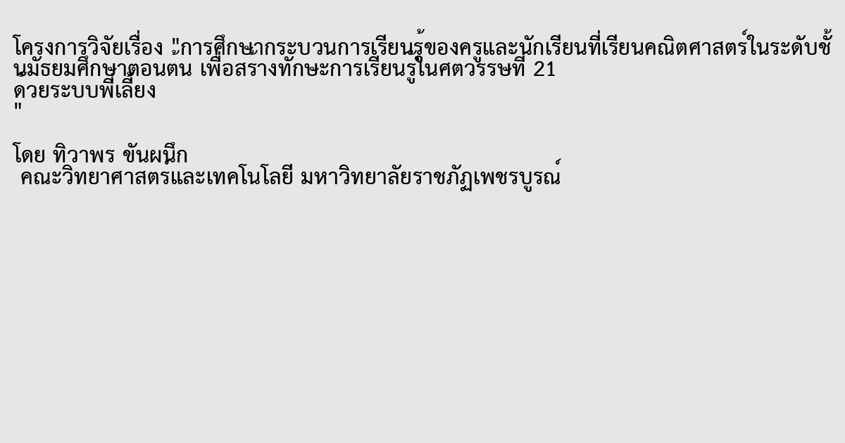 การศึกษากระบวนการเรียนรู้ของครูและนักเรียนที่เรียนคณิตศาสตร์ในระดับชั้นมัธยมศึกษาตอนต้น เพื่อสร้างทักษะการเรียนรู้ในศตวรรษที่ 21 ด้วยระบบพี่เลี้ยง